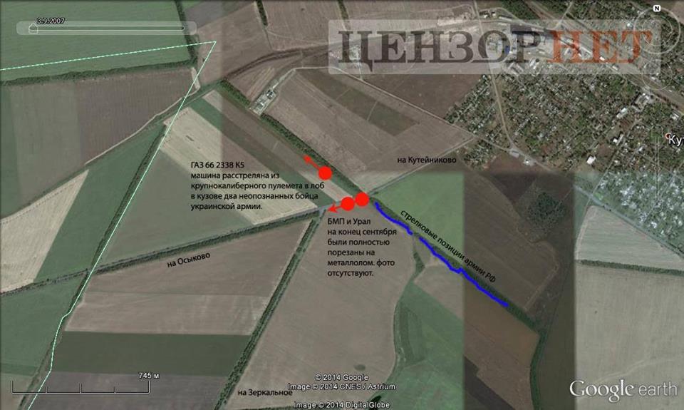 Було приблизно 12.15, коли з лісопосадки до перехрестку між Кутейникове і Дзеркальним на дистанцію 1100-1200 метрів виїхало три бойові машини без білих розпізнавальних смуг. Більше нікого з наших в цьому районі не було. Це міг бути тільки ворог. На полі біля перехрестя 28-а бригада залишила свою БМП під українським прапором. Російські бронемашини під'їхали до перехрестя і зупинилися для оцінки обстановки.
