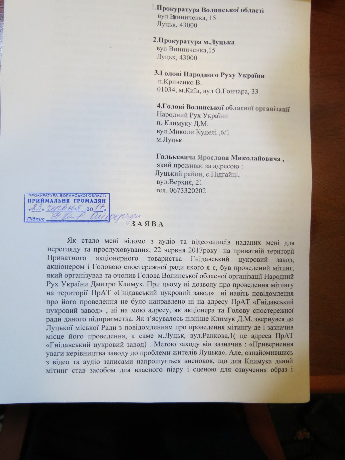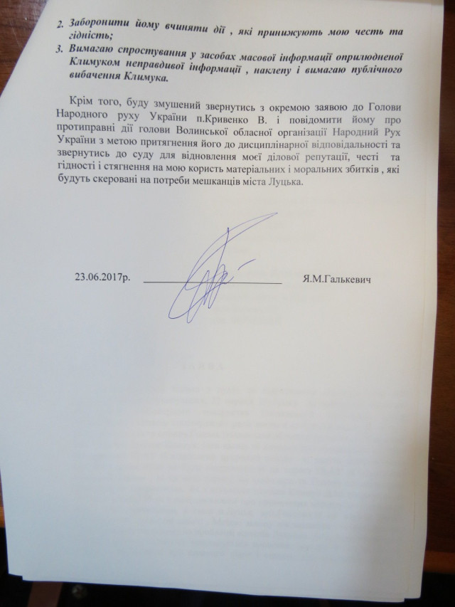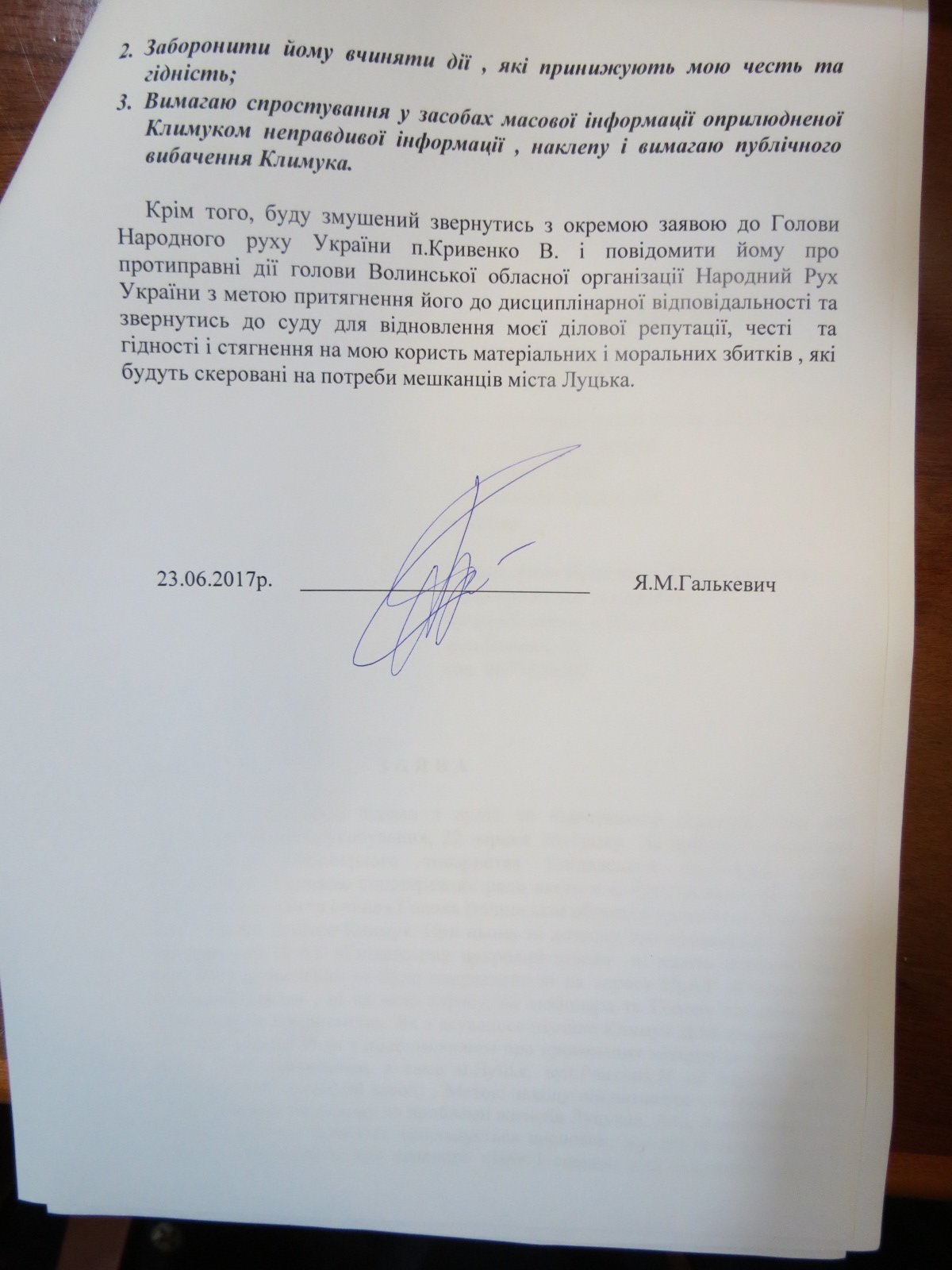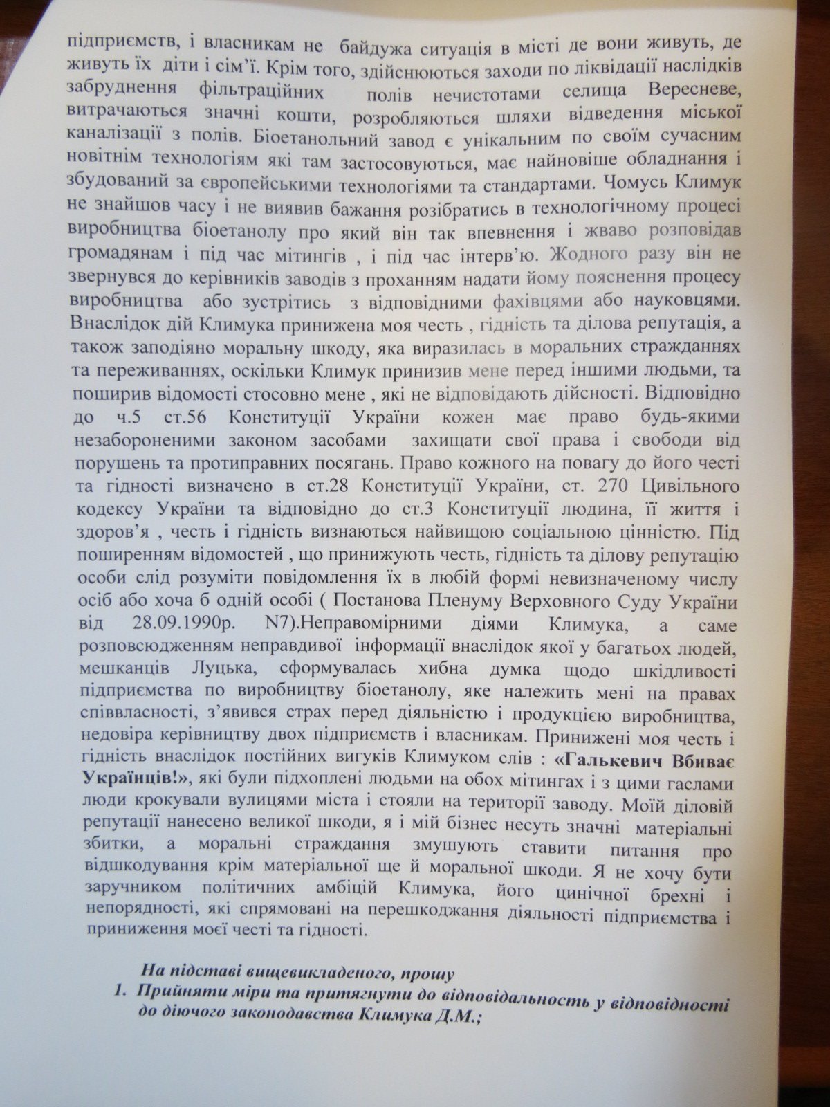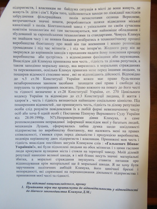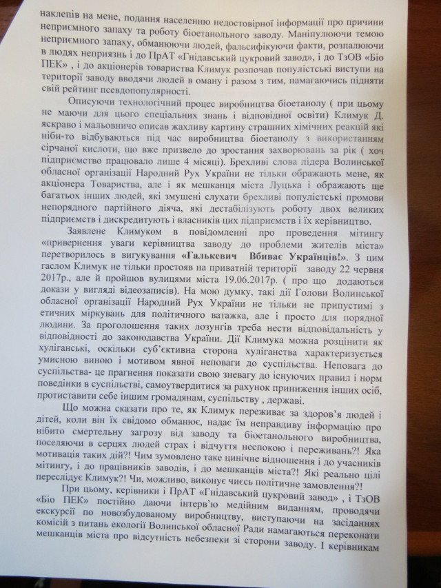 «Він (Дмитро Климук - ВН) підбурює людей, організовуючи мітинги, розповідає різні страшилки про сірчану кислоту, хімічне виробництво та ракові клітини, які зовсім не відповідають дійсності. Зрозуміло, що люди налякані. Більше того, цей молодий чоловік перейшов всі межі, звинувативши мене в тому, що нібито я вбивця, вбиваю українців. Аби відстояти своє чесне ім’я, я звернувся з відповідним позовом до суду про захист честі, гідності та ділової репутації й відшкодування моральної шкоди в сумі 1 мільйона гривень, які я зобов’язуюсь передати на благоустрій Луцька», - розповідає Ярослав Галькевич.