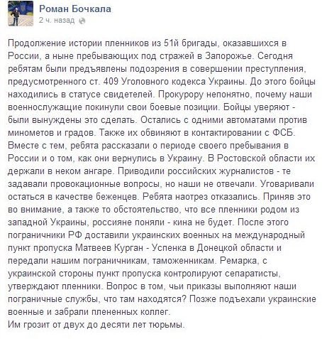 Продовження історії бранців із 51й бригади, які опинилися в Росії, а нині перебувають під вартою в Запоріжжі, опублікував у Фейсбуці журналіст телеканалу «Інтер» Роман Бочкала.