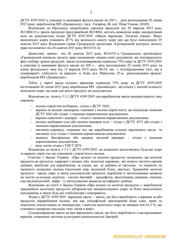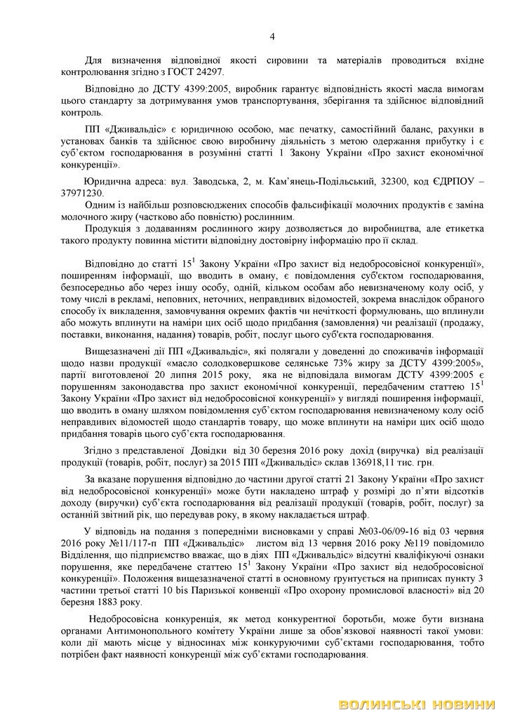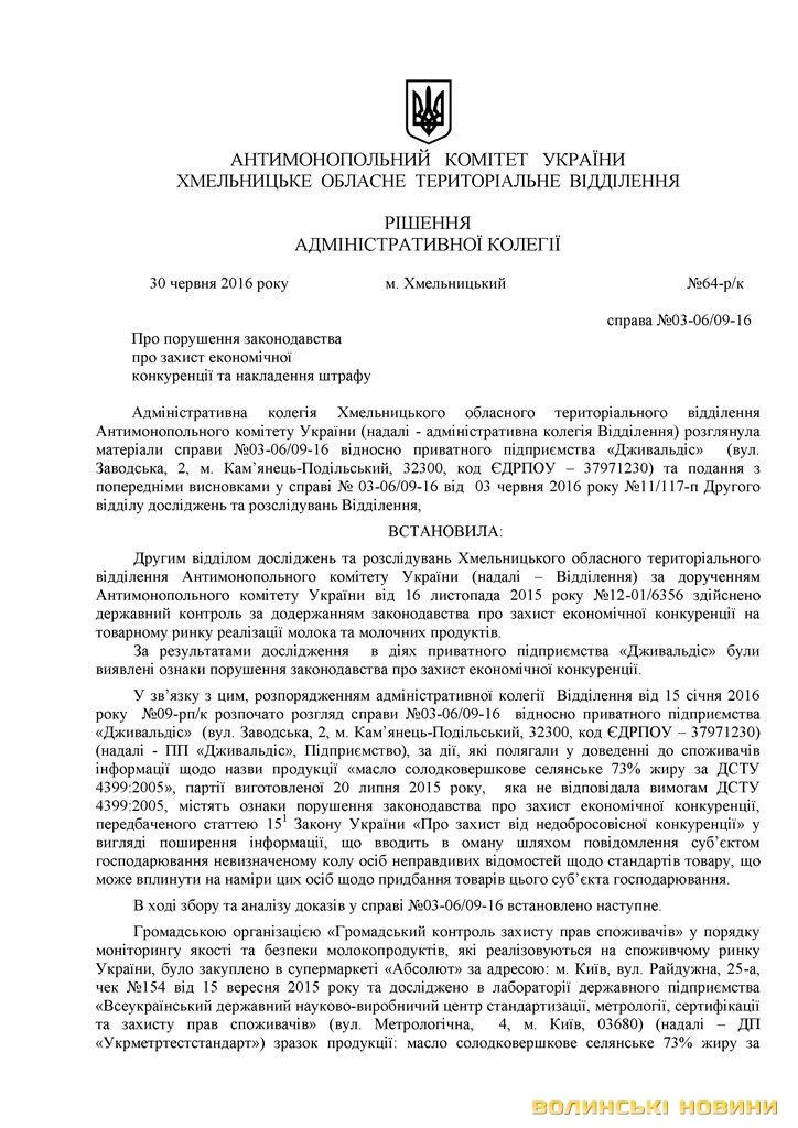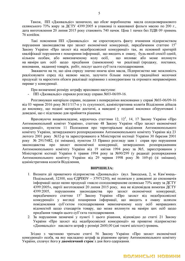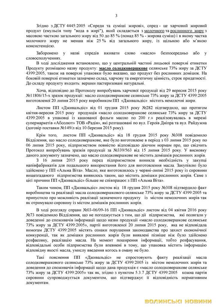 Щодо останнього, то в його діяльності Антимонопольний комітет України виявив порушення ще в червні 2016-го року. Зокрема бізнесмени продавали «спреди та суміші жирові» як масло солодковершкове селянське 73% жиру за ДСТУ. ПП «Дживальдіс» підтвердило факт виробництва та реалізації масла солодковершкового селянського 73% жиру за ДСТУ 4399:2005 та припустило про можливість реалізації зазначеного продукту із вмістом немолочних жирів, оскільки отримувало сировину із вмістом домішків рослинних жирів. За це підприємство сплатило штраф дві тисячі шістсот гривень.