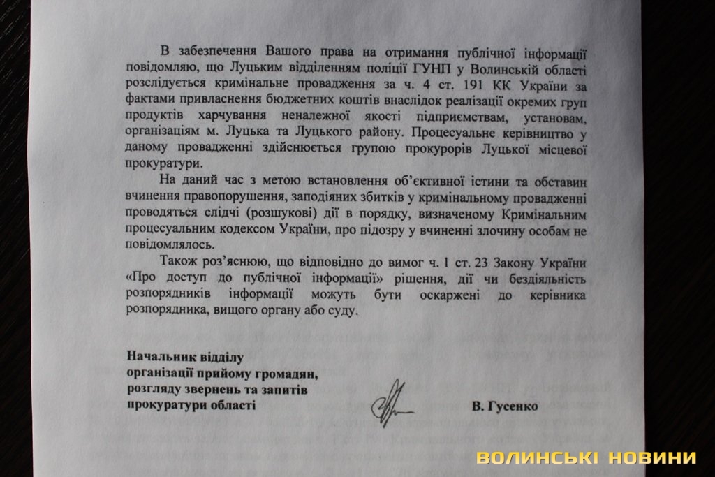 Втім, правоохоронці повідомили, що кримінальне провадження відкрите і йдеться про «реалізацію окремих груп продуктів харчування неналежної якості». Також в обласній прокуратурі додали, що підозру у вчинені злочину поки ще нікому не повідомили.Втім, начальник управління освіти Луцької міської ради Олег Гребенюк стверджує, що жодних обшуків не було, мовляв, відбувалася звичайна перевірка. А щодо неякісних продуктів харчування в ДНЗ повідомив, що такі ситуації час від часу трапляються, але вони «вирішуються».