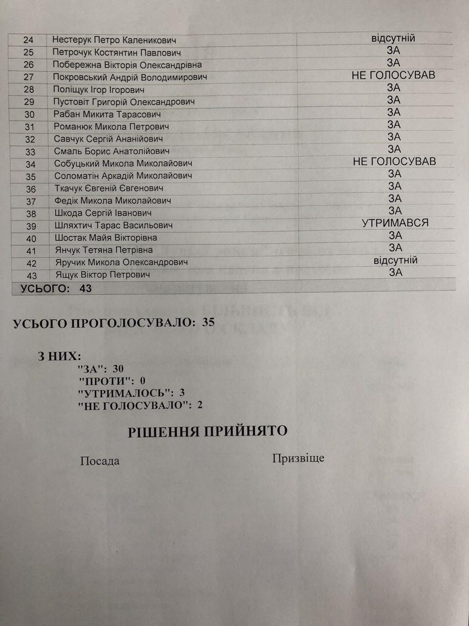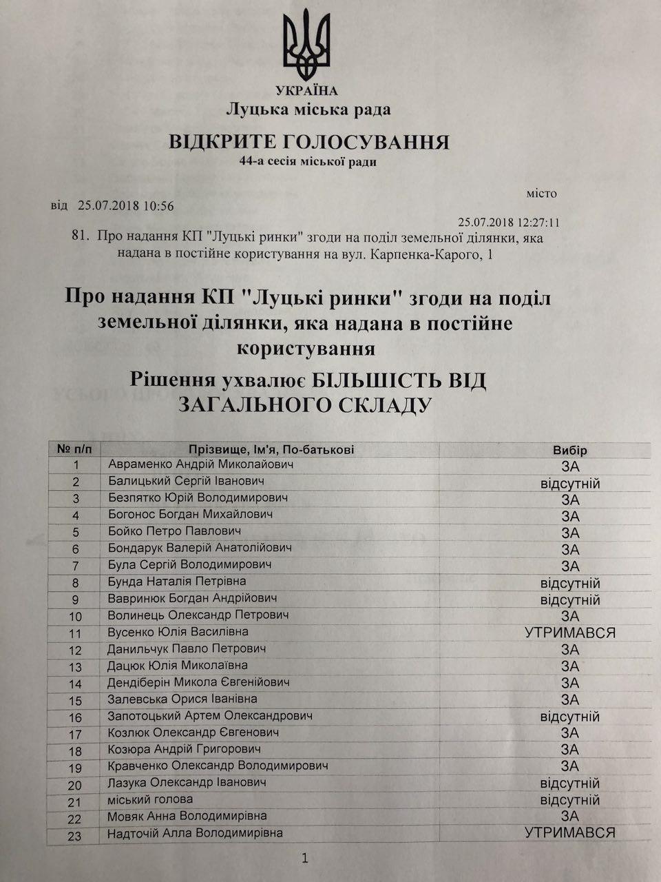Зокрема, утрималися від голосування за поділ земельної ділянки на ринку «Завокзальний» представники «Самопомочі» Юлія Вусенко, Алла Надточій, Тарас Шляхтич, не голосували депутат від БПП «Солідарність» Андрій Покровський та представник «Самопомочі» Микола Собуцький.Зі слів Ігоря Поліщука, 25 липня на засіданні сесії в руках депутата Юлії Вусенко з’явилася дуже дивна ухвала з суду, що відбувся сьогодні о 9 годині. У цій ухвалі йдеться про те, що міській раді забороняється вчинювати заходи щодо відчуження, поділу земельної ділянки тощо. Проте цей документ, зі слів Поліщука, немає до міськради ніякого відношення, оскільки земельна ділянка є в постійному користуванні «Луцьких ринків», і це постійне користування зареєстроване.