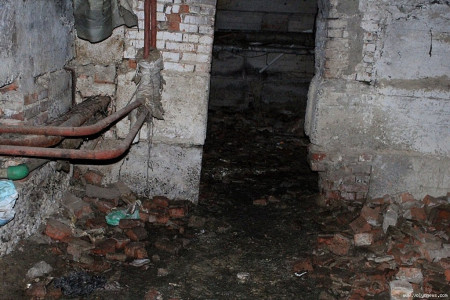 Далі по коридору – смердюче болото, пройти можливо лише пересуваючись по цеглинах чи інших предметах, що валяються на землі. Із стелі капає конденсат, а із труби опалення «легким душем» тече вода.