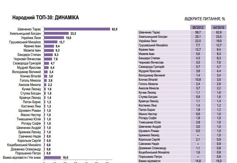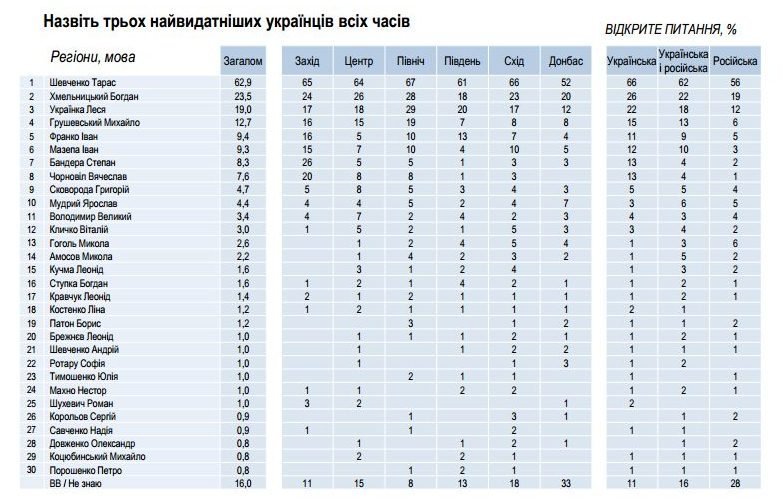 Всього опитаними були названі 174 персони. Разом з тим 16% опитаних не змогли назвати (згадати) жодного видатного українця.