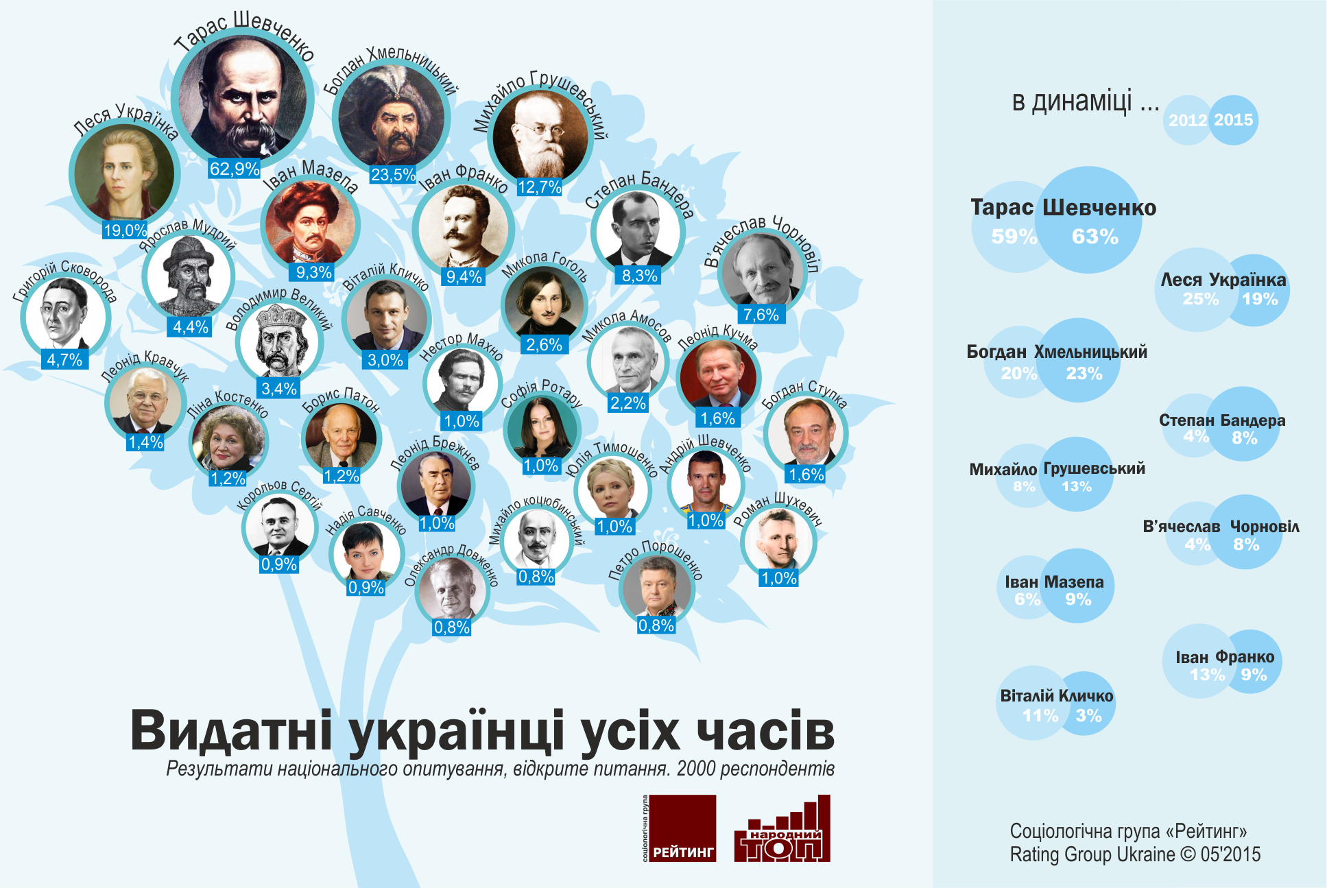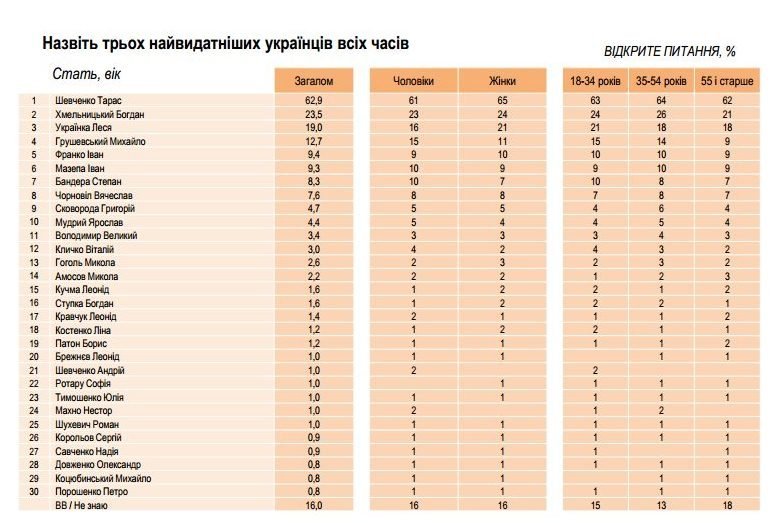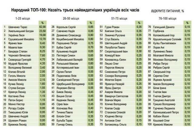 Згідно з результатами дослідження, більшість опитаних назвали серед найбільш видатних українців всіх часів Тараса Шевченка (62,9%). Доповнюють четвірку лідерів Богдан Хмельницький (23,5%), Леся Українка (19,0%) та Михайло Грушевський (12,7%).