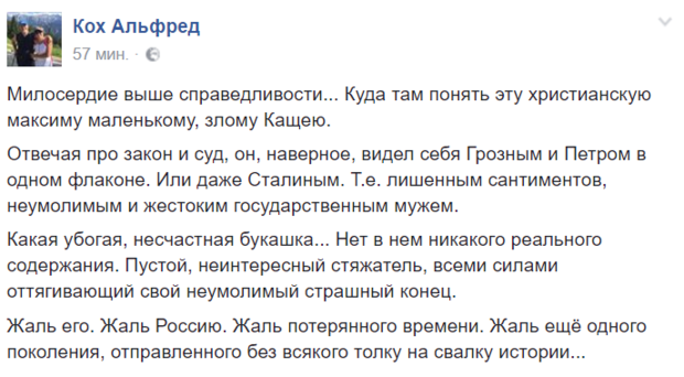 Про це на своїй сторінці у соцмережі написав колишній віце-прем'єр-міністр Росії Альфред Кох, коментуючи відповідь Путіна на прохання режисера Олександра Сокурова звільнити українця Олега Сенцова, - передає "Обозреватель".