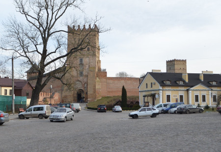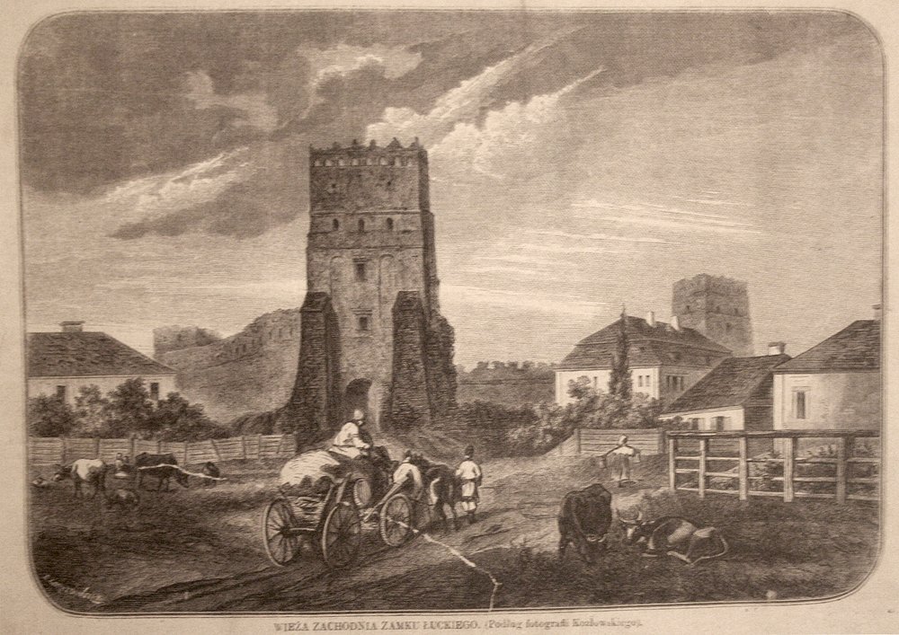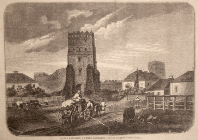 Одна із них вміщена у польському тижневику Tygodnik Ilustrowany 1867 року. Це репродукція дереворита (тобто гравюри на дереві) Гораздовського. На майдані перед замком – віз та воли, багнюка, дерев’яні паркани, місцеві жителі. Цікава деталь – вільний прохід на територію замку справа від головної вежі. У 1863 році В’їзну вежу замку і шматочок стіни біля неї продали на аукціоні за 373 рублі.