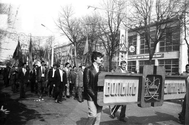 На фото – один із останніх парадів у Луцьку у вісімдесятих. На фоні – приміщення школи № 4. Цікаво, що конструкція з лампочок над проїзною частиною (на фото – біля лівого краю трохи вище від центру) збереглася донині.