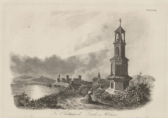 «По пріѣздѣ въ Луцкъ, обратился я къ полицеймейстеру съ просьбою о квартирѣ и разсказалъ ему, какимъ образомъ прибылъ. Такъ какъ прежде мы стояли отъ Луцка верстахъ въ двадцати, то я часто бывалъ тамъ и былъ знакомъ съ полицеймейстеромъ. Это былъ отставной раненый кавалерійскій маіоръ и прекрасный человѣкъ. «Ахъ, батюшка мой», сказалъ онъ мнѣ, «не знаю, что мнѣ съ вами дѣлать и гдѣ васъ помѣстить. Вы не можете себѣ представить, что у насъ за суматоха… Всѣ дома заняты и нѣтъ уголка свободнаго. Тутъ князь Багратіонъ со всѣмъ своимъ штабомъ… вся армія собралась около Луцка… Давай квартиры, строй печи для заготовленія сухарей, давай дрова, давай подводы и все на свѣтѣ. Мнѣ приходится просто хоть въ рѣку броситься… Когда я сказалъ князю, что невозможно выполнить такихъ требованій, то онъ закричалъ: «Знать ничего не хочу… Чтобъ было, не то — повѣшу».Луцьк початку ХІХ століття на роботі Августа Франка Алеса. Зображення з La Pologne, historique, litteraire, monumentale et pittoresque