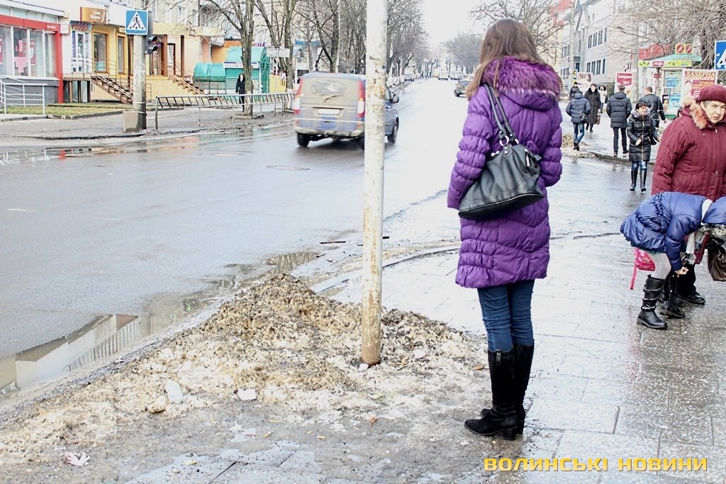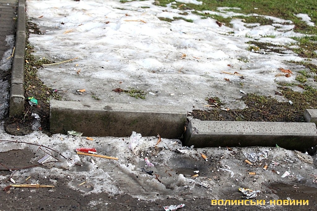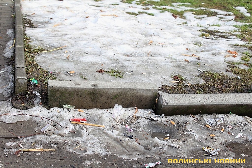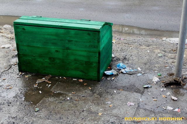 На проміжній маршрутній зупинці, що між Універмагом «Луцьк» та бізнес-центром «Директорія» (перед світлофором на Винниченка), відсутній смітник, тож люди, які очікують на приїзд свого транспорту, кидають недопалки та сміття прямо на тротуар.