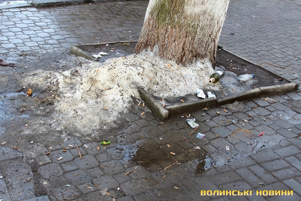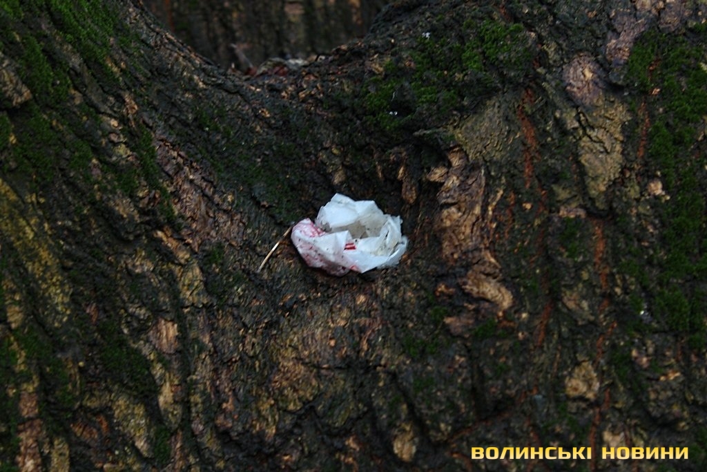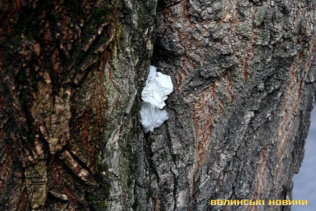 А й справді, асфальт на зупинці рясно усіяний пакетиками, цигарками, подекуди навіть порожніми пляшками від алкогольних напоїв. Дійшло до того, що пасажири маршруток, уподібнившись білкам, заштовхують сміття в дупло бідолашного деревця, що росте поряд із зупинкою. Давайте з’ясуємо, чому страждає нещасна рослина: через невихованість лучан чи через бездіяльність комунальників?