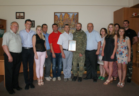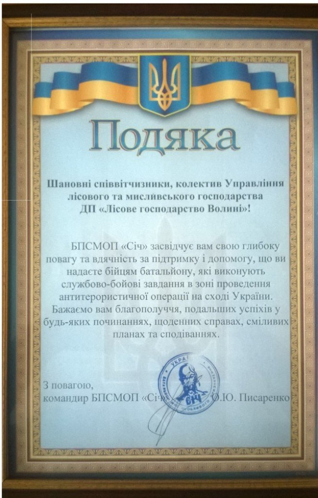 Командир роти батальйону спецпризначення «Січ» Максим Морозов (позивний “Лютий”) вручив подяку працівникам Волинського управління лісового та мисливського господарства за вагому допомогу та підтримку бійцям, які виконували службово-бойові завдання в зоні проведення антитерористичної операції на сході України. Про це інформують у прес-службі Волинського обласного управління лісового та мисливського господарства.