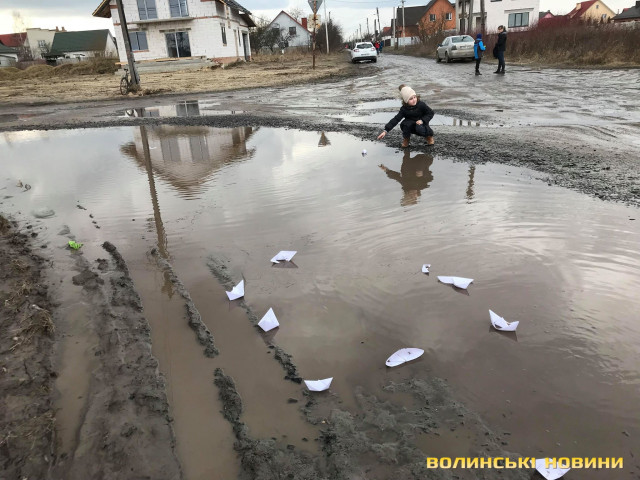 Запустивши десятки паперових корабликів, діти та дорослі запросили міського голову разом з ними у гумових чоботях ходити до школи, садочка та автобусної зупинки баюрами, які тут є замість доріг та тротуарів.