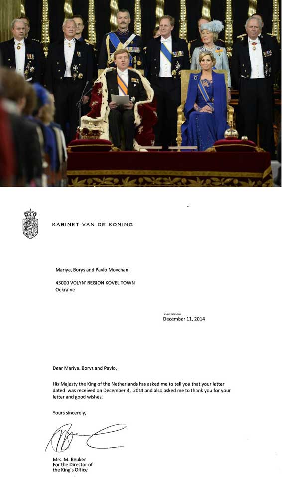 Директор Канцелярії Короля Нідерландів – Майоран Беукер повідомила Марійку, Бориса та Павла Мовчанів, що європейський монарх вдячний юним волинянам за їх звернення. «Його Величність Король Нідерландів вдячний Вам за лист та добрі побажання». Так написано у листі зі столиці Нідерландів – Амстердаму, - повідомляє «ПроКовель» з посиланням на прес-центр «Дитячі мрії».