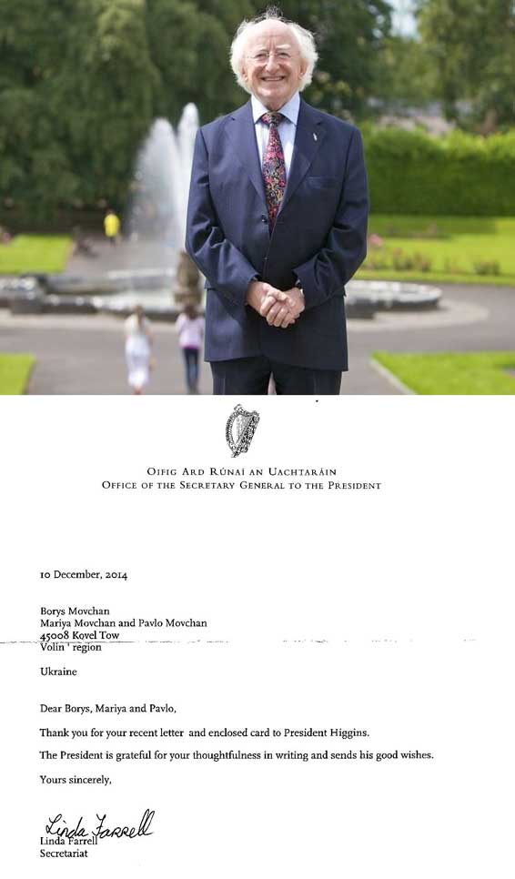 Натомість, Президент Ірландії, Майкл Хігінс, не тільки висловив «юним дипломатам» свої найкращі побажання, а й подякував за присвоєння Йому почесного звання людини добра, світла та справедливості! Секретар Президента, Лінда Ферел, зазначила: «вдячні вам за лист та сертифікат. Президент вдячний за вашу вдумливу увагу у листах».