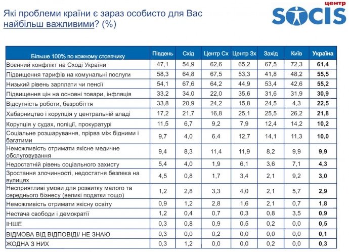 Так, війна на сході України непокоїть 61,4% опитаних, високі комунальні тарифи – 55,5%, низький рівень зарплат чи пенсій – 55,2%, а зростання цін і інфляція – 30,9%.