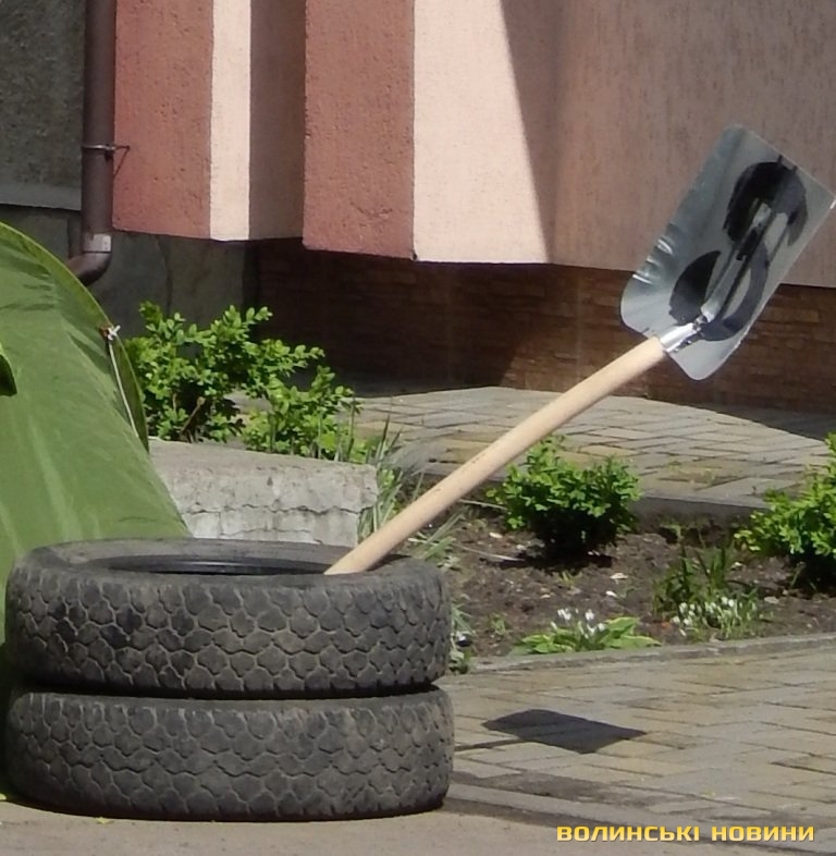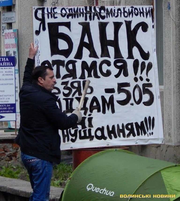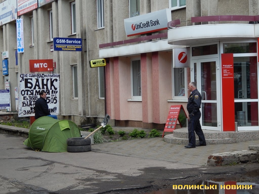 У самому центрі Ковеля чоловік середнього віку влаштував пікет біля одного з комерційних банків. Він з’явився тут десь о десятій годині ранку, встановив чималий стенд із своїми претензіями, туристичну палатку, дві автомобільні шини, в які встромив совкову лопату, та почав періодично гамселити палкою металеву бочку, викрикуючи, очевидно до керуючої банківської установи, щоб вона одумалася.