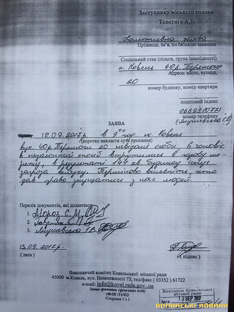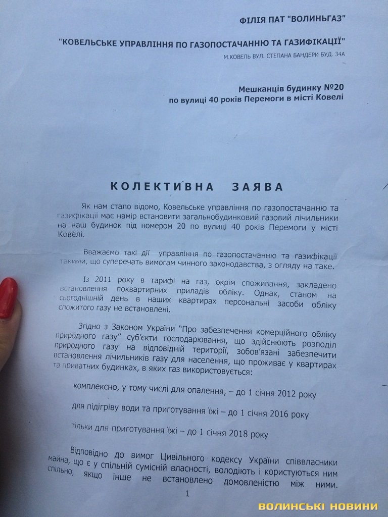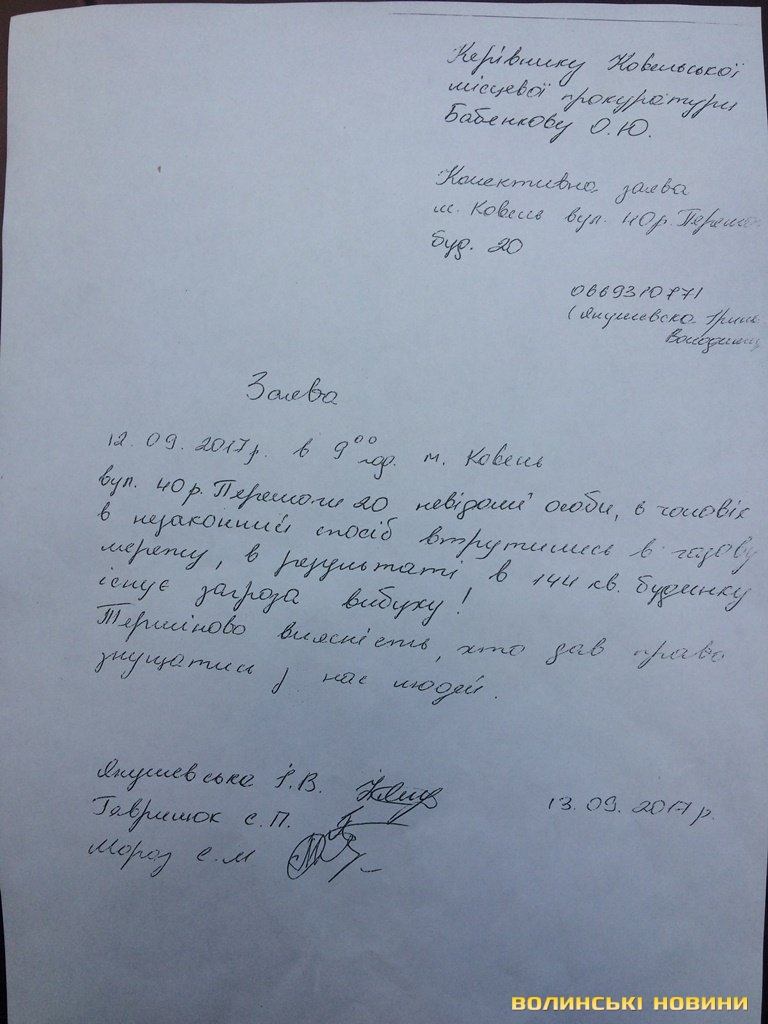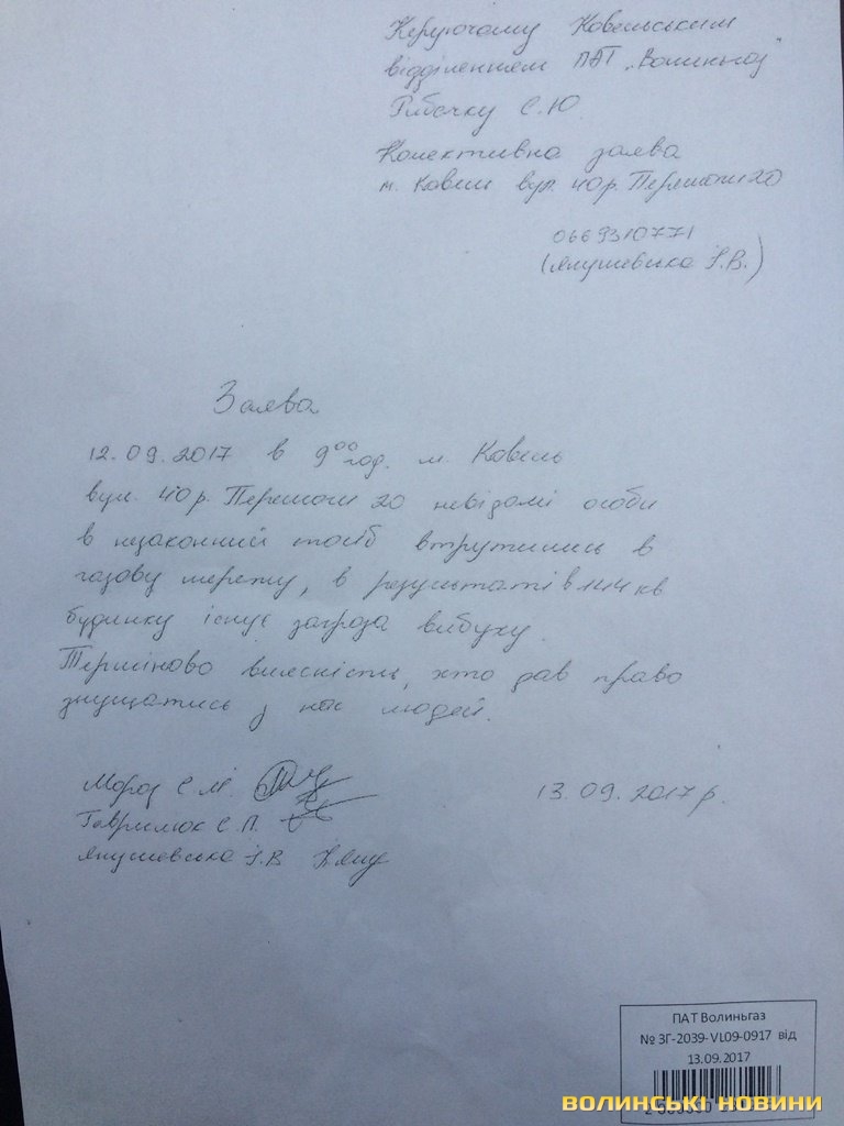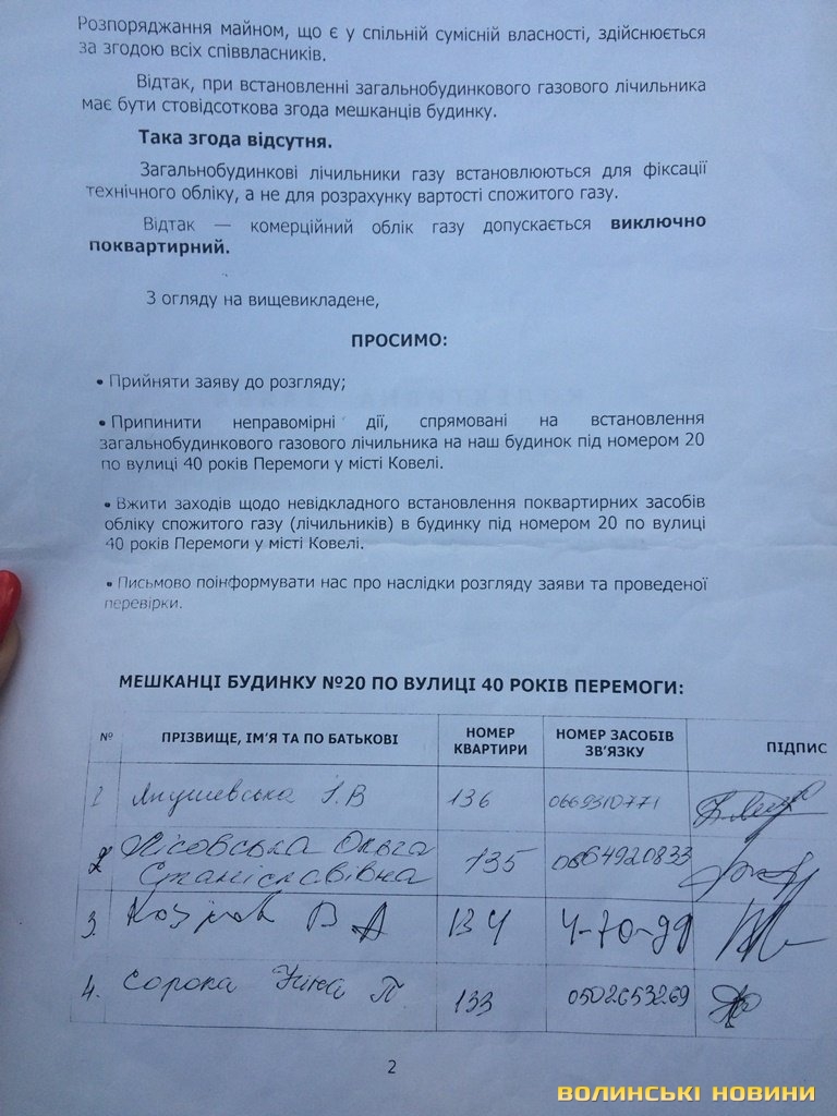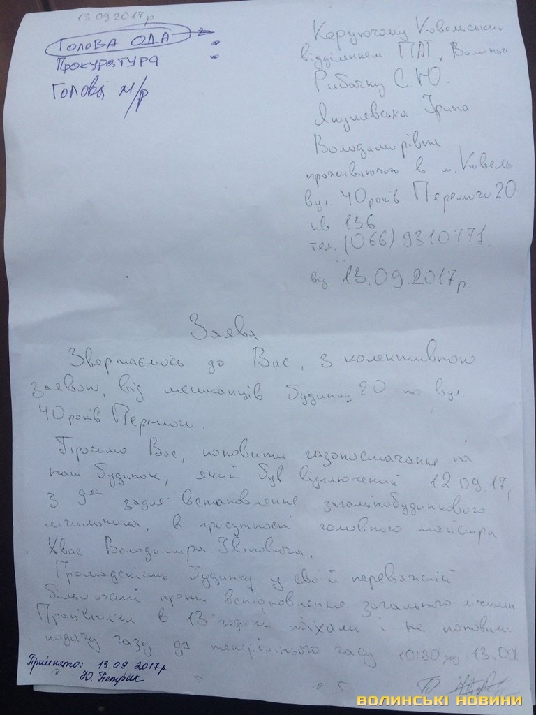 Обурені мешканці будинку звернулися із письмовими заявами до міської влади, Ковельської місцевої прокуратури, у Ковельський відділ поліції та безпосередньо до самого керівника Ковельської філії ВАТ «Волиньгаз» Сергія Рибачка.