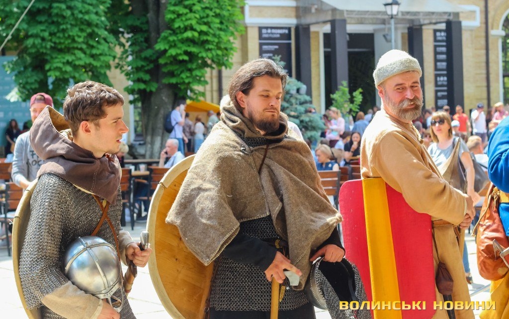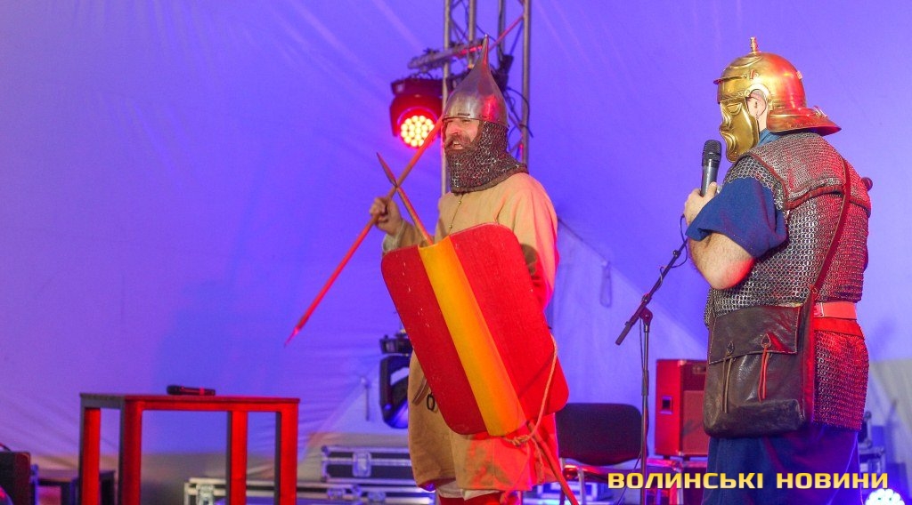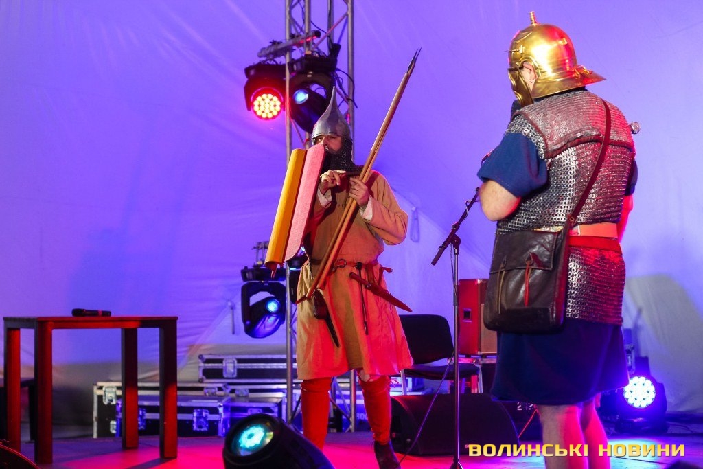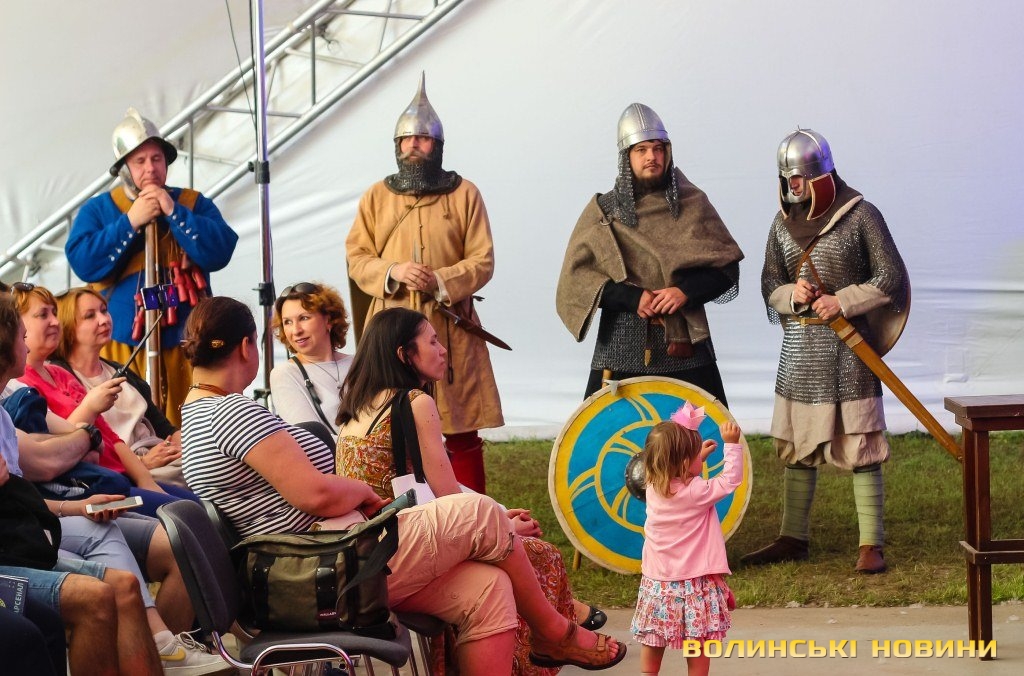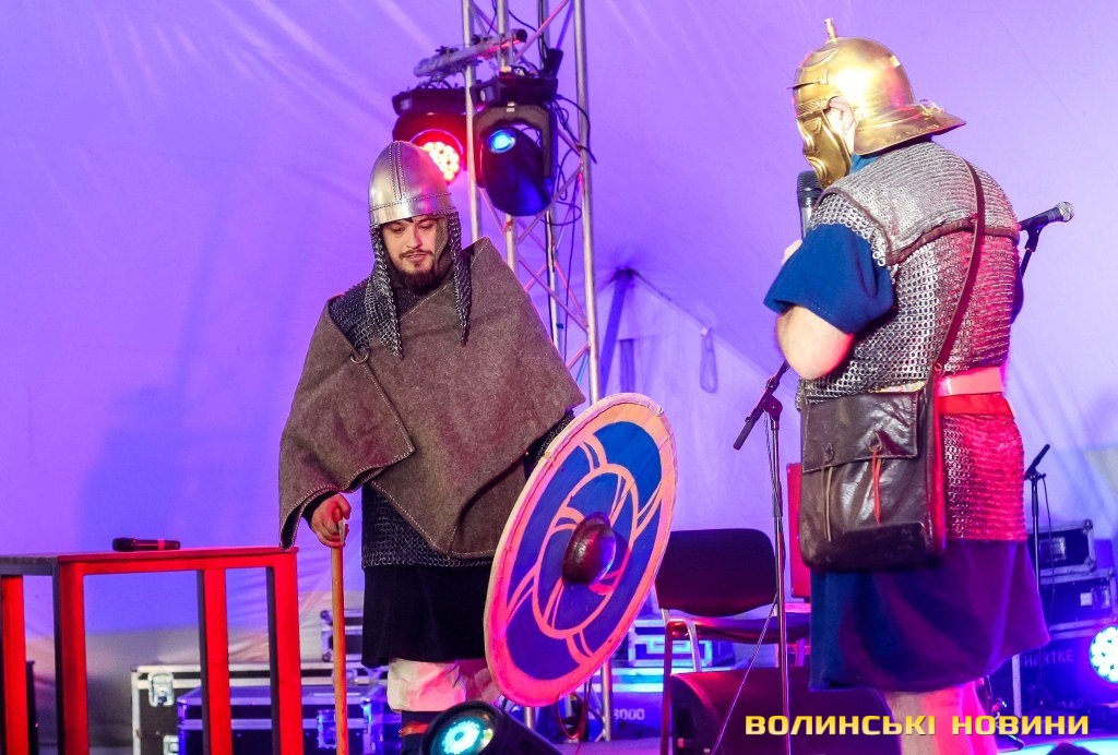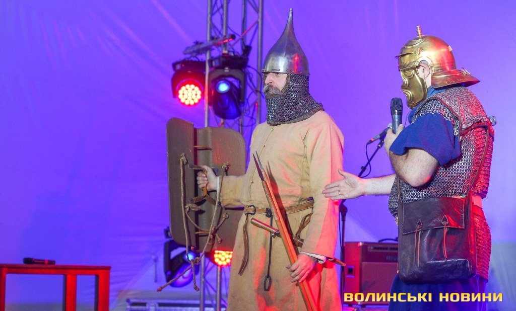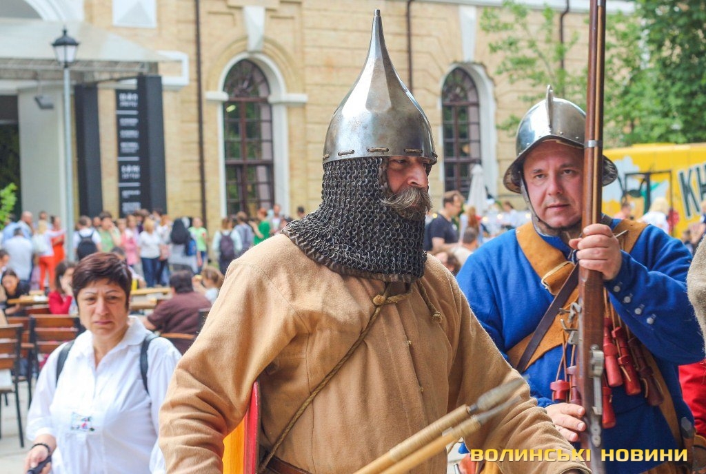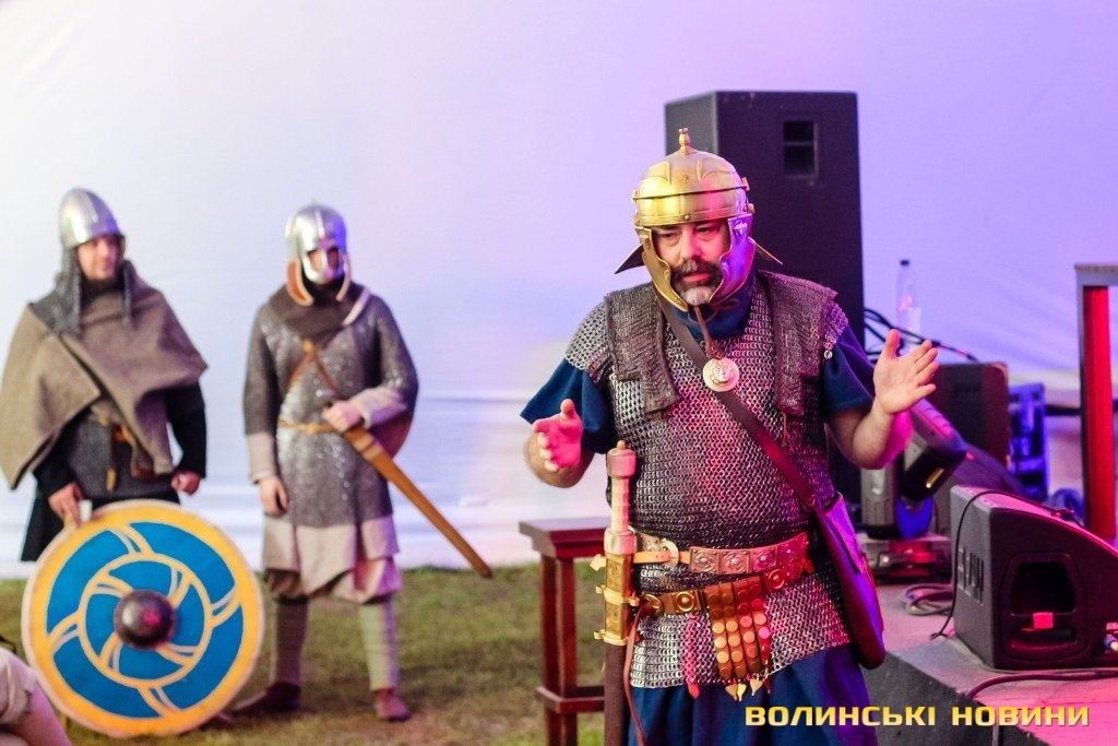Реконструктори демонстрували спорядження вояків різних історичних періодів. Так, показали давньоруського вояка 9-го століття (реконструкція на базі знахідок). Подібним міг бути і варязький найманець – він мав кольчугу, шолом, щит, озброєний мечем. Вбраний він в один із варіантів «шароварів», описаних арабськими письменниками (зокрема Ібн-Русте). Це фактично не шаровари, а інакші за кроєм штани з великої кількості тканини. На одну штанину мало йти до 50 ліктів тканини, тобто таку кількість міг дозволити собі тогочасний «мультимільйонер», який не жалів грошей. Штани збиралися на поясі та защипалися під коліном. Інша цікава деталь – захист обличчя, відтворений на прикладі експоната Національного музею історії України. Такий варіант вважають найбільш реалістичним.