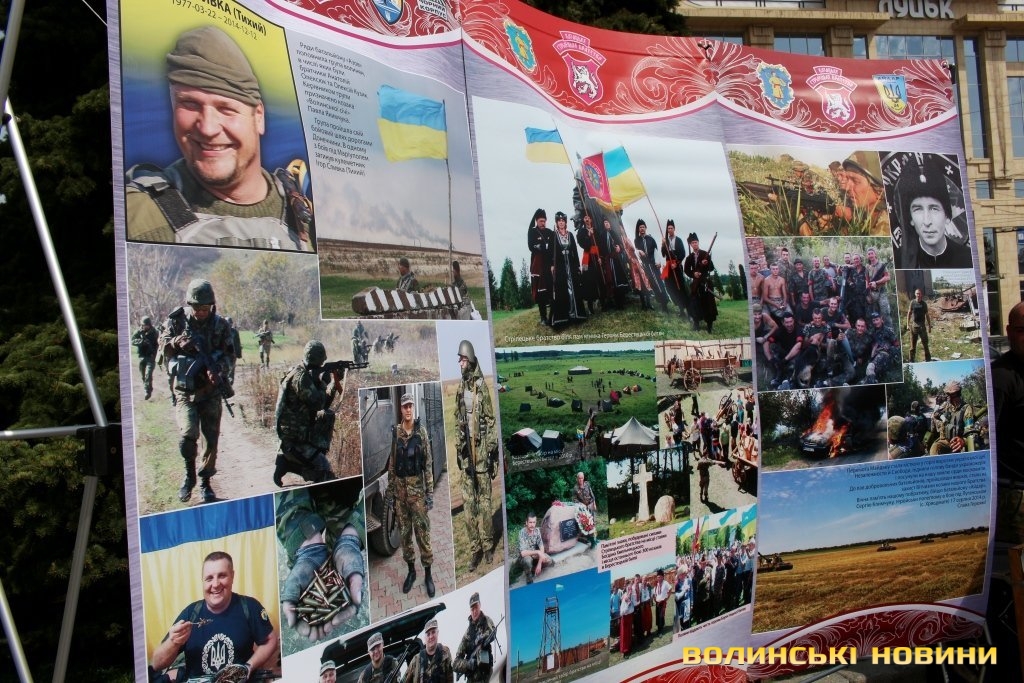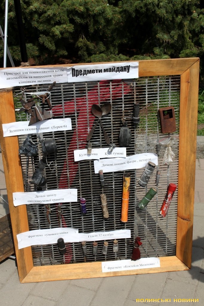 У рамках експозиції предметів Майдану лучанам демонстрували залишки газових гранат «Терен-6», газові та гумові кулі, димові шашки, фаєри та петарди, деталі запалу світло шумових гранат, фрагменти «коктейлю Молотова» тощо. Поряд розташували стенд, присвячений козакам-волинянам, загиблим в зоні проведення АТО.