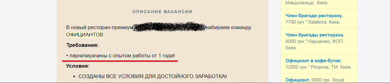 у функціональні обов’язки буде входити питання набору текстів, вміння готувати чай, каву – має бути досвід роботи. Не має бути зайвих вимог: якщо ми говоримо про офіціанта чи офіціантку – абсолютно без різниці, якого віку та зовнішності людина, якої довжини її ноги чи руки, це може бути як чоловік, так і жінка, адже робота полягає у знанні меню, ввічливому ставленні