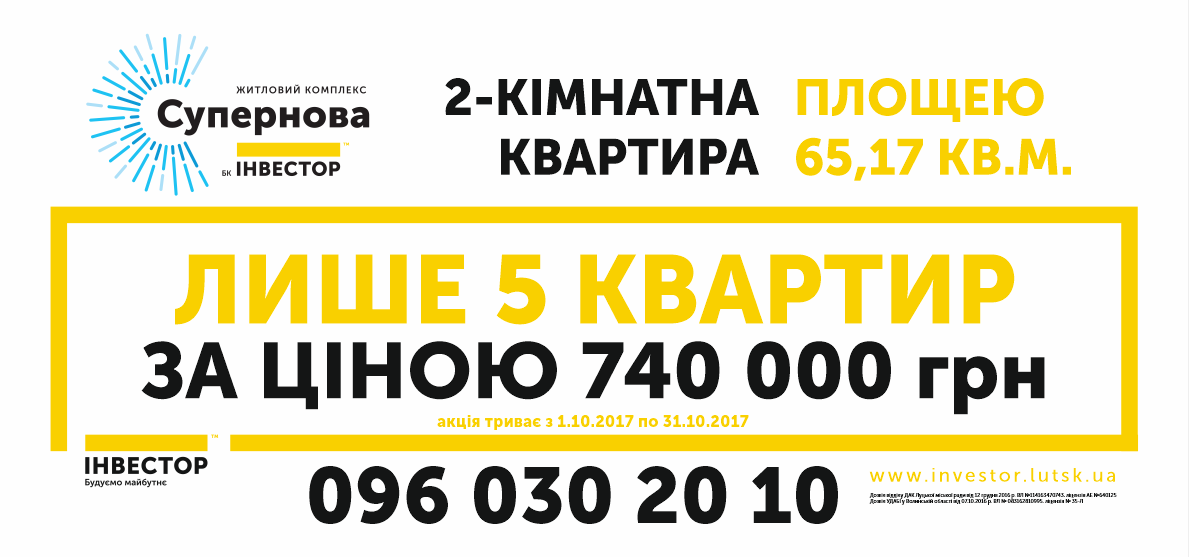 «У нас зараз здаватимуться будинки і є 5 двокімнатних квартир площею 65,17 метра квадратних, які ми пропонуємо придбати за фіксованою ціною - 740 тисяч гривень. До кінця року вони будуть здані в експлуатацію, знаходяться в ЖК «Супернова». Помешкання гарні, сонячні, виходять на південну сторону. Вони всі в одному місці, в трьох будинках, які поряд», - наголошує Андрій Разумовський.Акційних квартир лише 5, тому варто поспішати, адже помешкання розташовані в районі вулиць Львівської та Потебні, поруч ботанічний сад та мальовничі береги Стиру, а до центру міста – менше двох кілометрів. Просторе планування, креативна робота дизайнерів, ретельно продумана інфраструктура - це стиль компанії «Інвестор», яка дарує комфортне та якісне житло.І вже традиційно, «Інвестор» дарує покупцю готовий сучасний дизайн квартири.