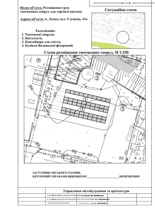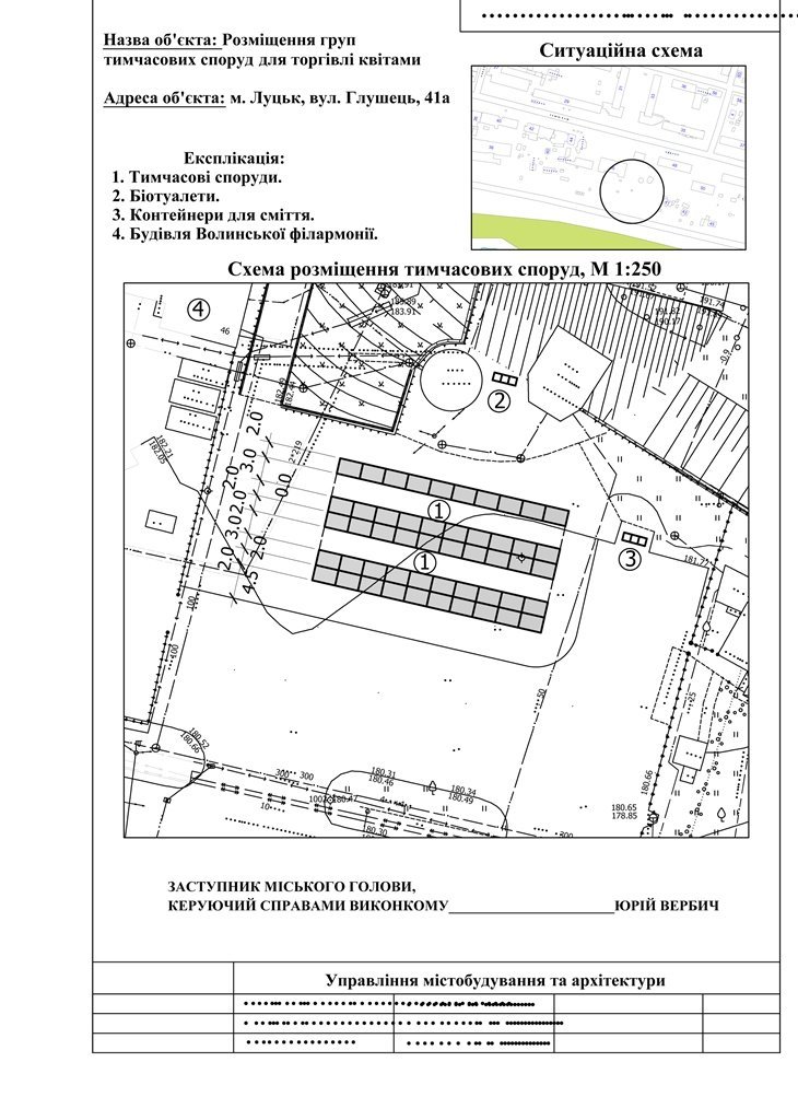 Враховуючи викладене, управління містобудування та архітектури розробило проект-схему розміщення тимчасових споруд на вулиці Глушець, 41а. Ця територія, відповідно до Плану зонування міста Луцька, є громадською зоною, в якій передбачено розміщення таких ринків. Крім цього, поблизу проектної групи тимчасових споруд знаходяться необхідні підземні мережі для їх обслуговування та парковка автотранспорту.Однак, члени виконкому не погодили це.