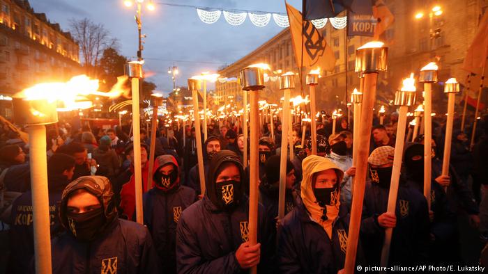 На День захисника України в Києві пройшли масові акції націоналістичних партій. Правопорядок забезпечували працівники поліції. Даних про серйозні інциденти не надходило, пише DW.
