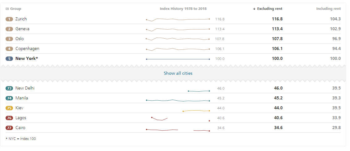 Таким чином, "Велике яблуко" опинилося на п'ятому місці. Вище Нью-Йорка за вартістю розташовані Копенгаген, Осло, Женева і найдорожчий - Цюріх.