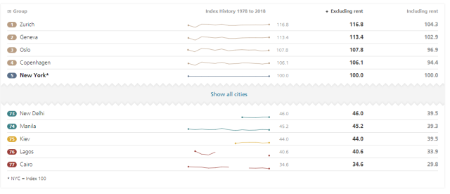 За еталон було взято вартість проживання в Нью-Йорку, яка має індекс 100. Індекс інших країн розраховувався відносно нью-йоркського. Всього до рейтингу входять 77 міст.