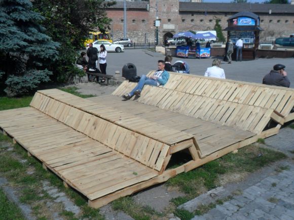 Такий дивний об'єкт створили у рамках унікального проекту «Майстерня міста», ціль якого - розвиток та оновлення міста. Лавочка унікальна тим, що дає змогу не лише посидіти з комфортом на площі, а й полежати, дивлячись на небо.