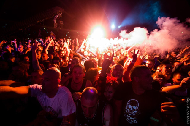 «Нехай той, хто побажає землі ближнього свого, отримає по хитрій лисячій пельці, а той, хто захоче війни, нехай здохне відразу», - вигукнув Міхалок до натовпу. Послухати виступ гостей із Білорусі навідався й Київський міський голова Віталій Кличко, який подякував «ляпісам» за підтримку українців під час Євромайдану та потиснув руку солісту Сергію Міхалку. Він зауважив, що пісні гурту стали для українських патріотів символом боротьби, і подякував гурту за творчість. Варто зазначити, що у четвер, 28 серпня, у Санкт-Петербурзі гурту «Ляпіс Трубецкой» заборонили співати культову пісню «Воины света», мовляв, це гімн Євромайдану і його небажано виконувати в Росії. Незважаючи на те, що музиканти дотримались слова, пісня на теренах РВ таки зазвучала. Щоправда, її заспівали фанати, які прийшли до клубу на провести улюблений рок-гурт.