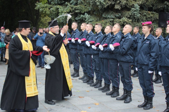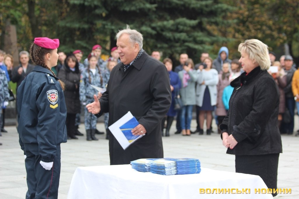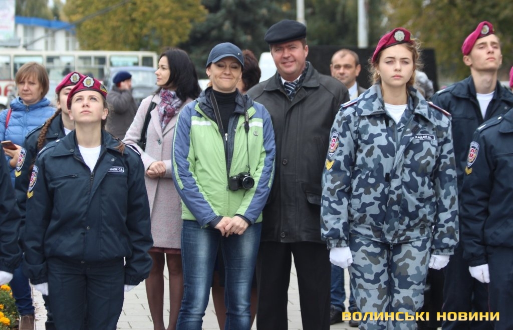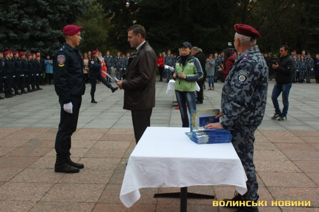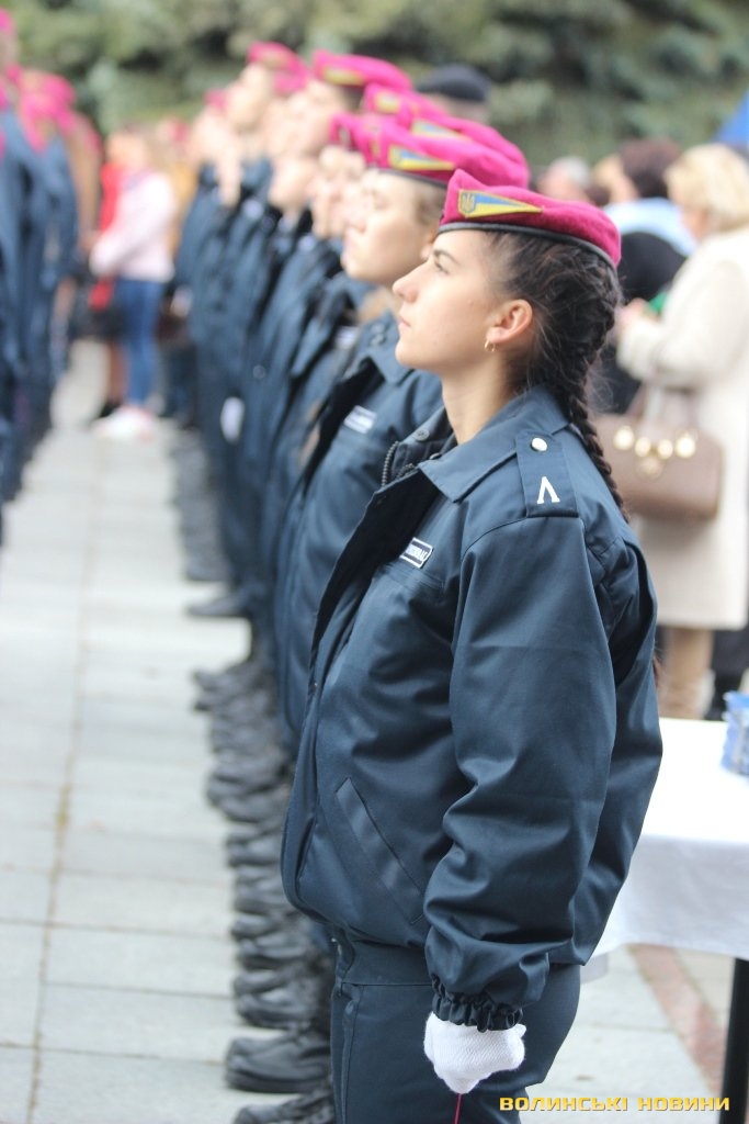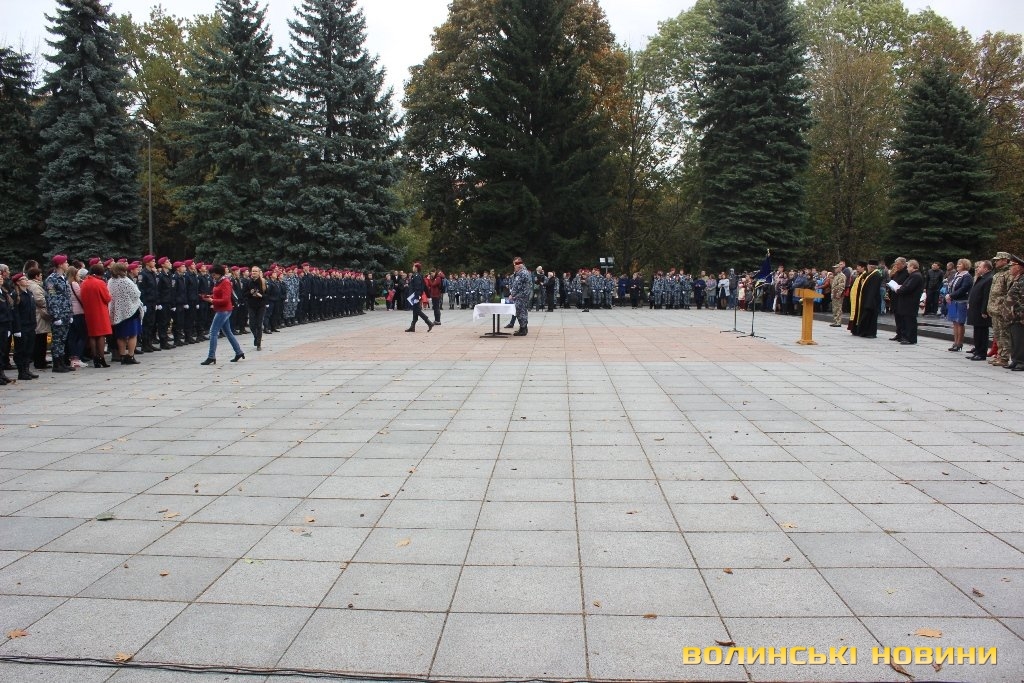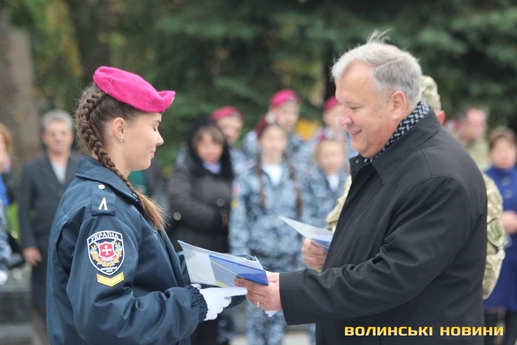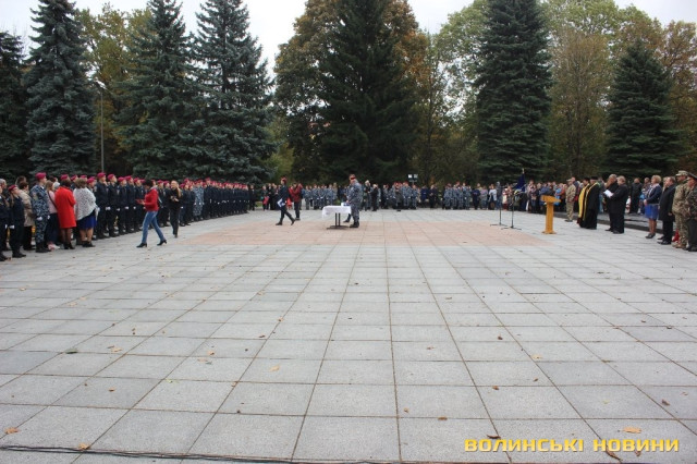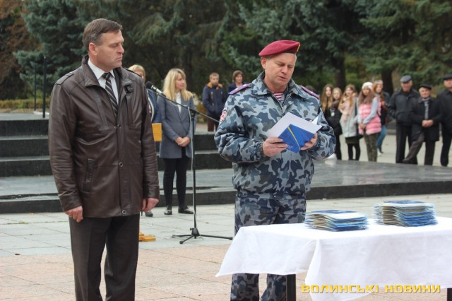 «У переддень наших великих українських патріотичних свят - Дня захисника України, Дня українського козацтва, 75 річниці з дня утворення УПА, у переддень свята Покрови - вітаю Вас із посвятою. Ви зробили важливий та відповідальний крок у своєму житті, ви прийняли вибір, який змінює вас. Це складний шлях, але почесний та відповідальний. Кожен із вас ставить перед собою мету, і я бажаю її досягнути та реалізувати себе як особистість, як українець», - звернувся до ліцеїстів Григорій Пустовіт.Начальник Головного управління Національної поліції у Волинській області Петро Шпига зауважив, що попереду у них важка робота.