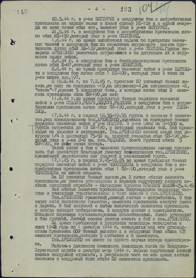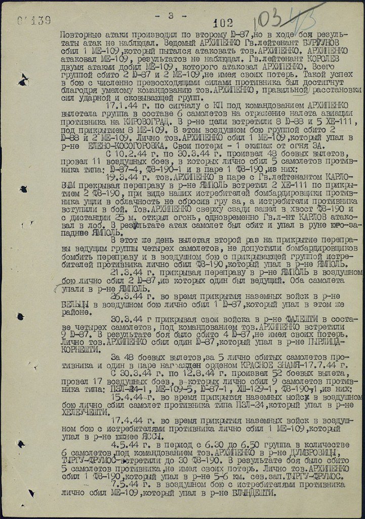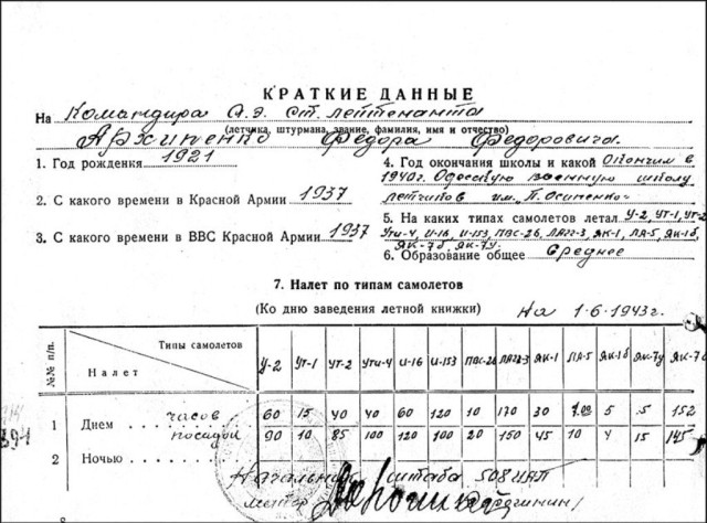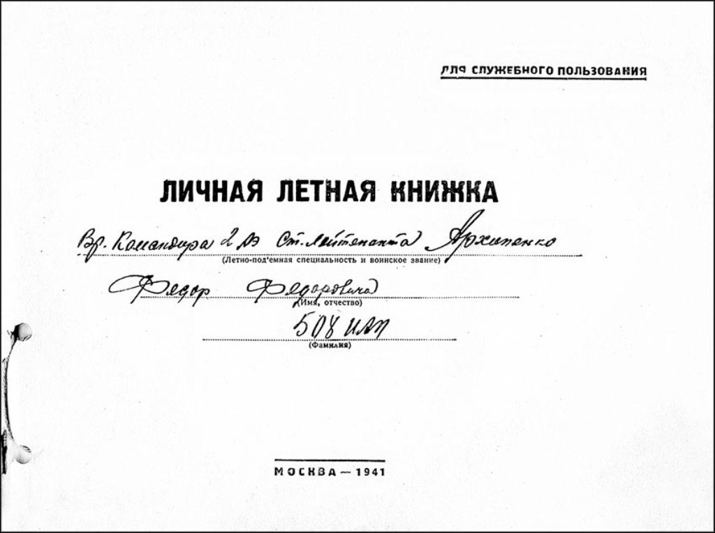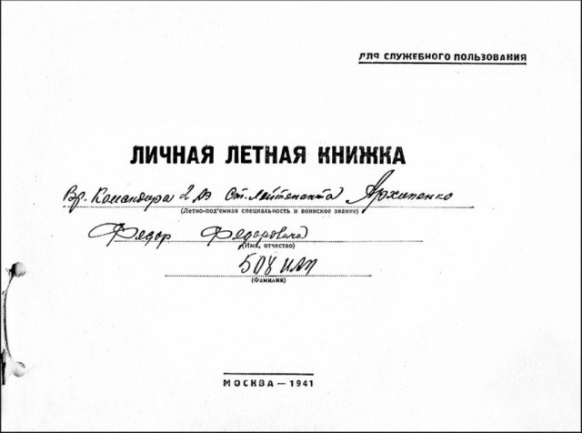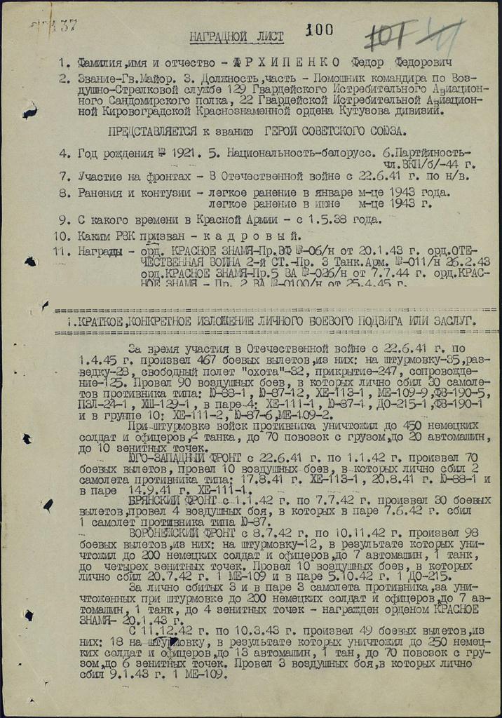 На фото - скани нагородних документів з Центрального Архіву Міністерства Оборони в місті Подольськ Московської області, в яких вказано про присвоєння майору Архіпенку Ф. Ф. звання Героя Радянського Союзу, а також унікальні скани його особистої льотної книжки.