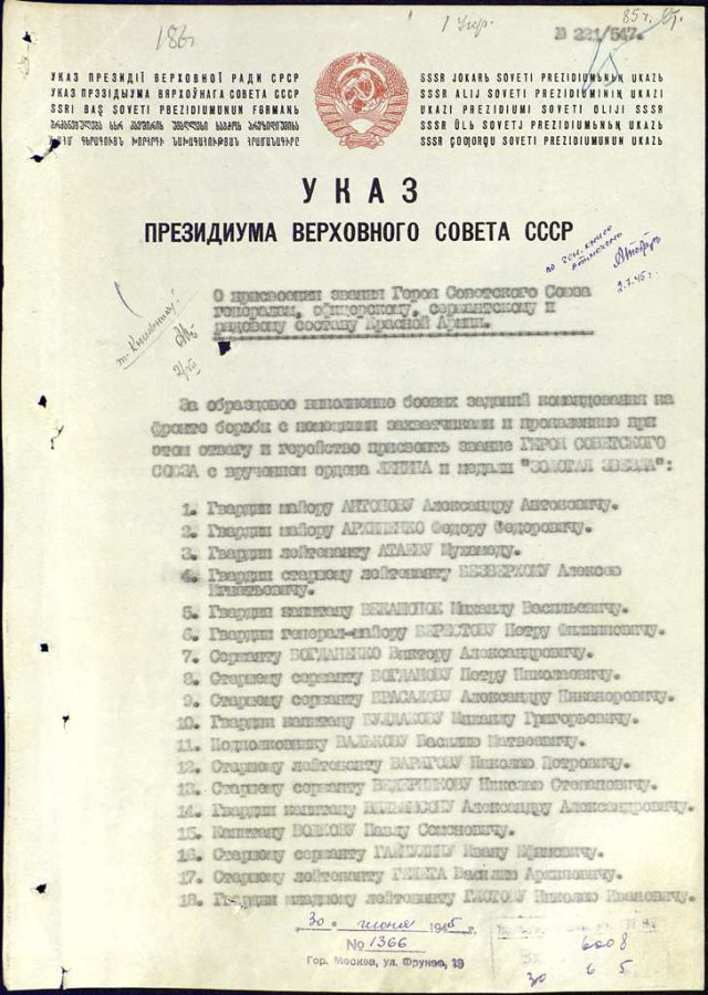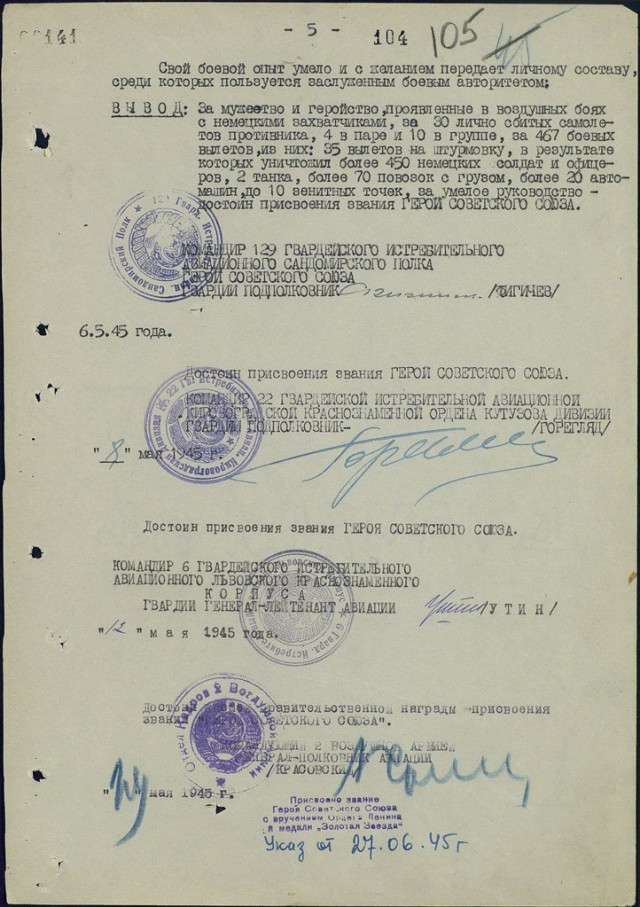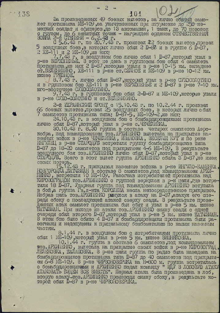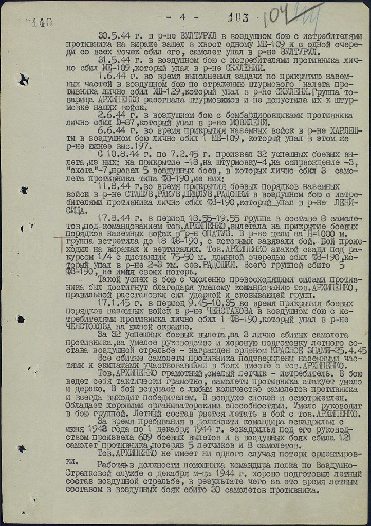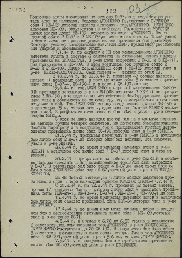 На фото - скани нагородних документів з Центрального Архіву Міністерства Оборони в місті Подольськ Московської області, в яких вказано про присвоєння майору Архіпенку Ф. Ф. звання Героя Радянського Союзу, а також унікальні скани його особистої льотної книжки.