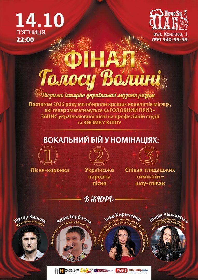 Фінал голосу Волині відбудеться у Луцьку 14 жовтня. Початок концерту - 22.00. Місце проведення - Лучеськ Паб.