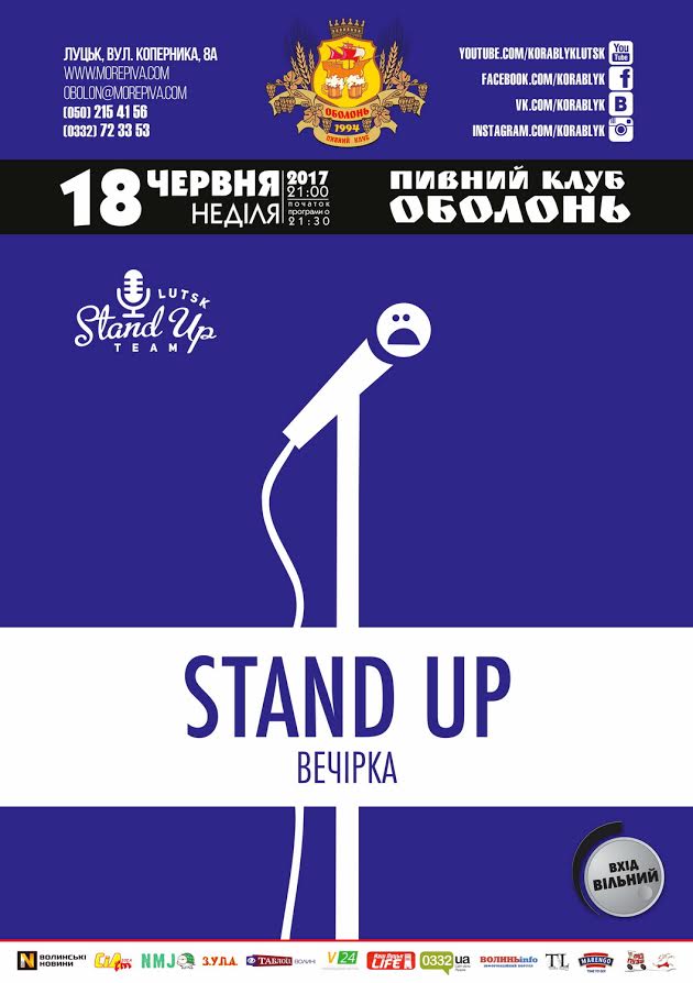Резиденти «Stand up Lutsk team» Вадим Барабуха, Артем Лиман та Стас Ольшевський влаштують на сцені пивного клубу «Оболонь» авторські монологи на актуальні теми, імпровізації з залом та й просто додадуть трішки позитиву «шхуні».