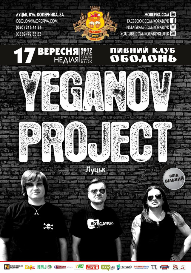 Гурт «Yeganov Project» дасть концерт у луцькому пивному клубі «Оболонь» 17 вересня о 21.30.