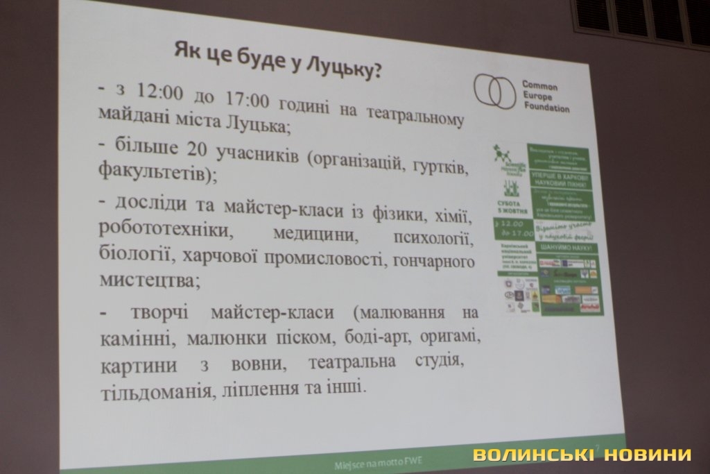 У суботу, 27 вересня з 12.00 до 17.00 на Театральному майдані майстер-класи та експерименти демонструватимуть представники різноманітних галузей науки, а розбавлять наукові досліди творчістю – наприклад, майстер-класами з боді-арту, малюнку піском, малюнку вовною тощо. Захід відбудеться за сприяння Луцької міської ради.