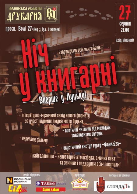 Книголюбів чекають 27 серпня у книгарні Волинської обласної друкарні, що на проспекті Волі, 27. Захід розпочнеться о 21.00.