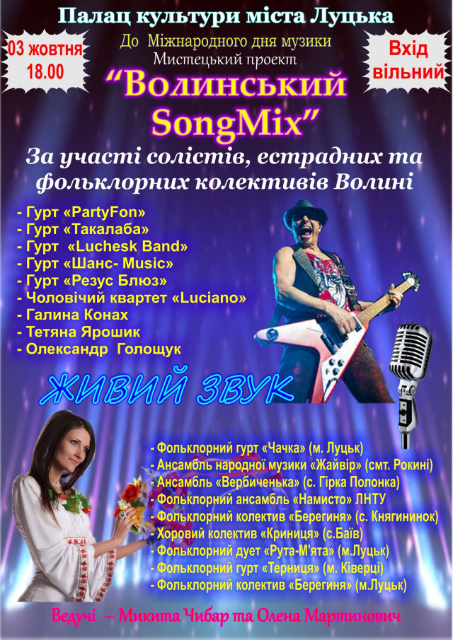 Концерт під назвою «Волинський SongMix» відбудеться у Палаці культури міста Луцька 3 жовтня, повідомляють організатори.