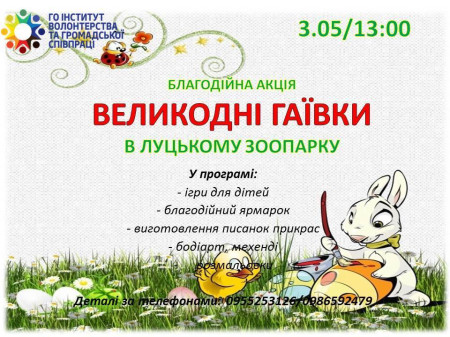 Інститут волонтерства та громадської співпраці й Луцький зоопарк запрошують лучан і гостей міста на благодійну акцію «Великодні гаївки». Захід відбудеться у третій день світлого Христового Воскресіння, 3 травня, о 13.00 в Луцькому зоопарку.