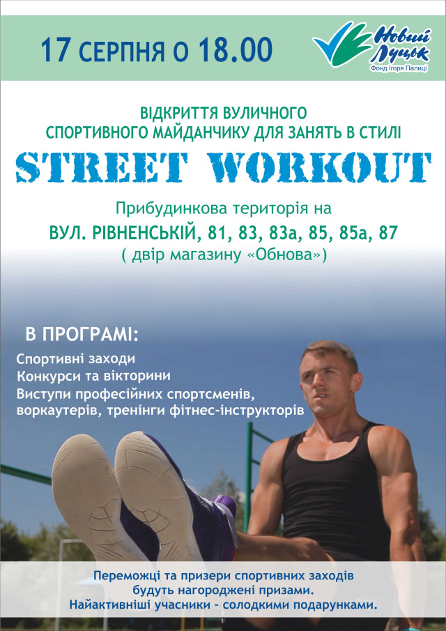 У Луцьку відбудеться відкриття вуличних спортивних майданчиків для занять фізичною культурою у стилі «Street WorkOut». Повідомляють у прес-службі Фонду «Новий Луцьк».