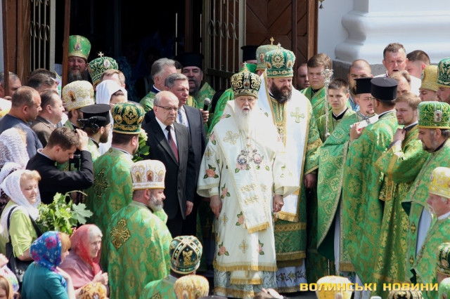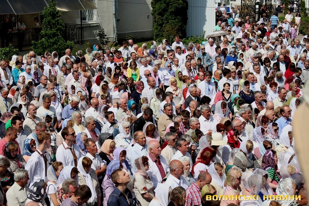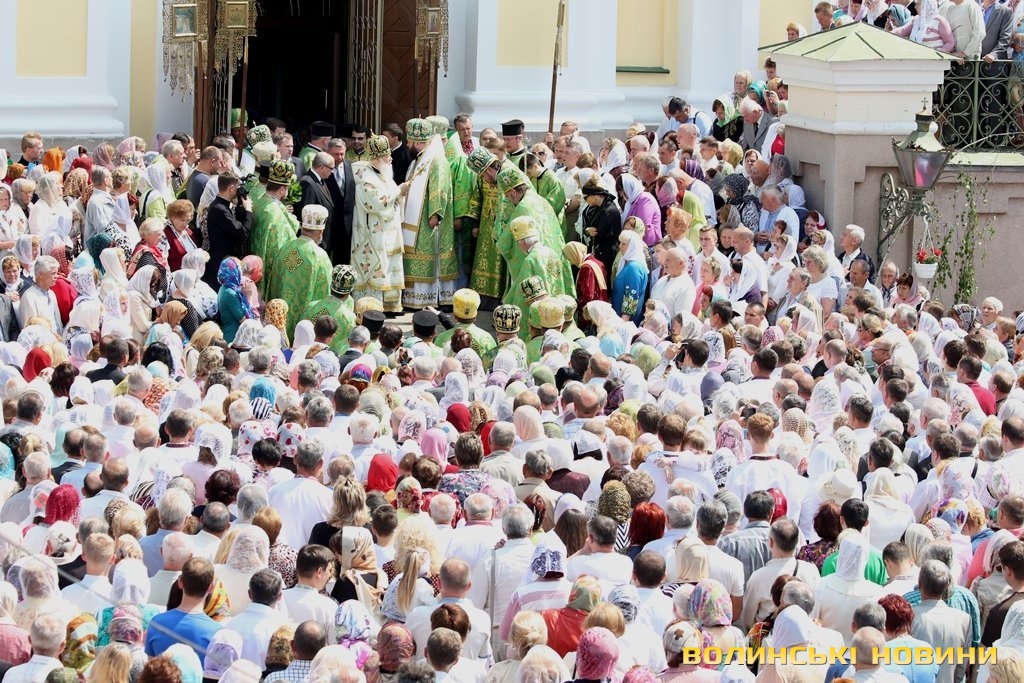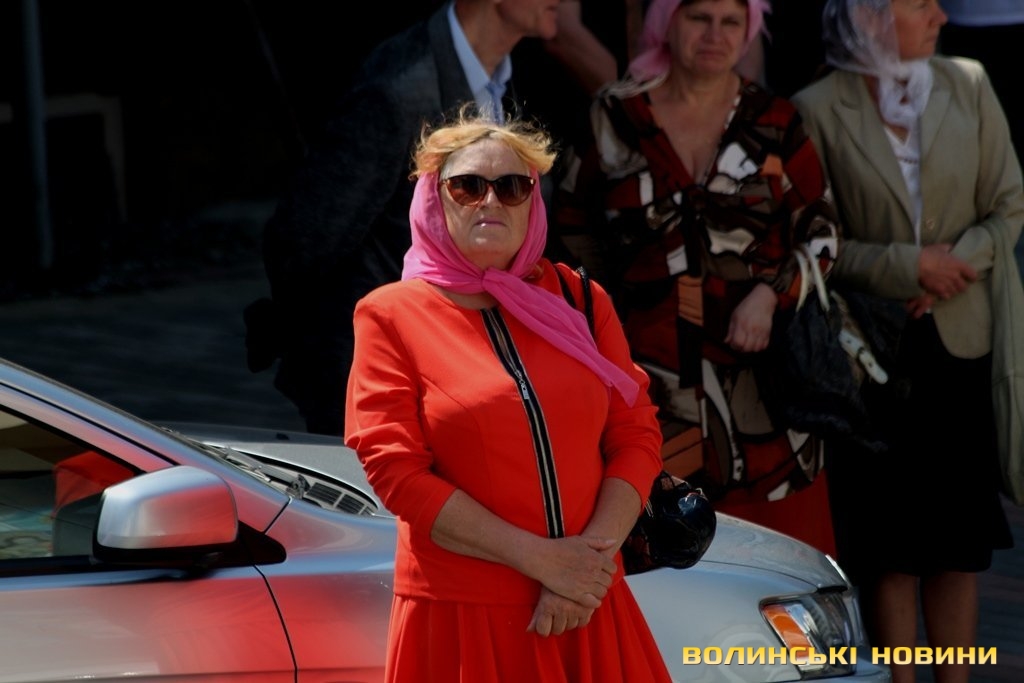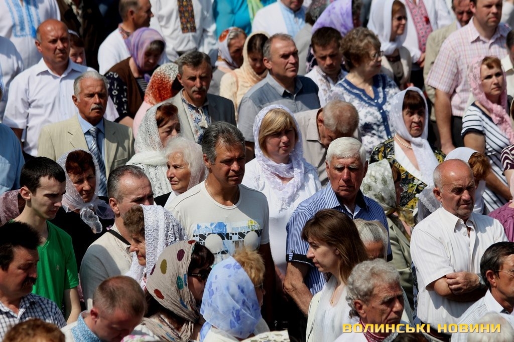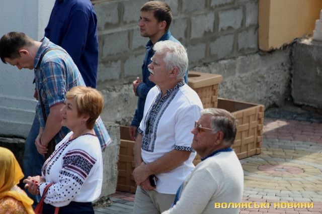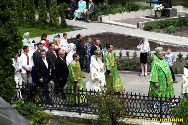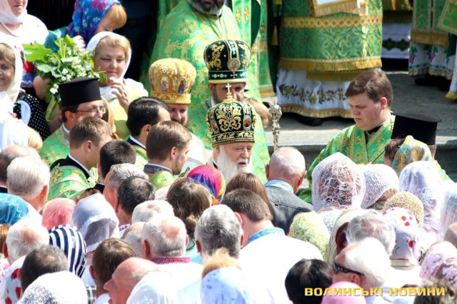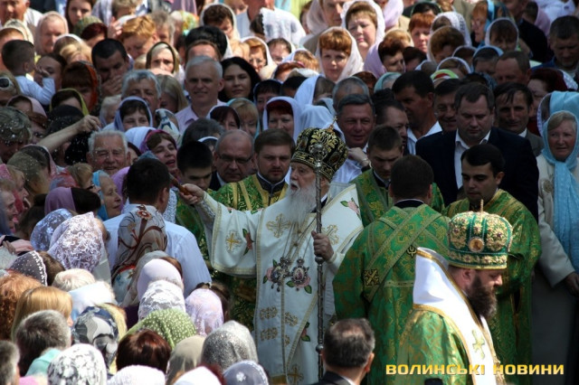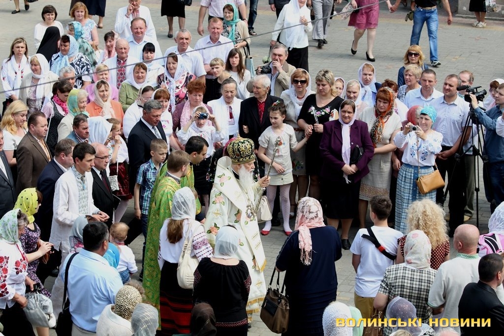 Потому всі рушили хресною ходою навколо храму. В перших рядах за патріархом йшли волинські владці – голова ОДА Володимир Гунчик, голова облради Валентин Вітер, Луцький міський голова Микола Романюк. Вони стояли поруч з патріархом і на сходах наприкінці богослужіння.