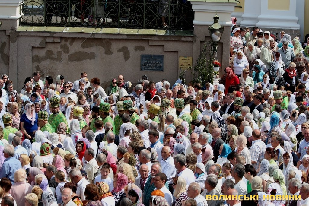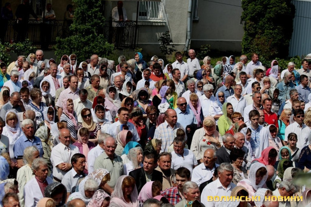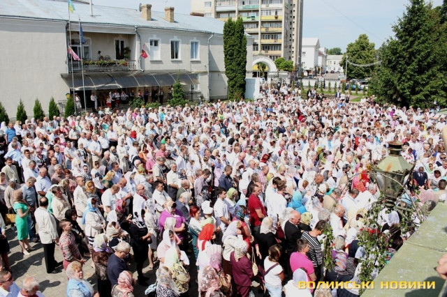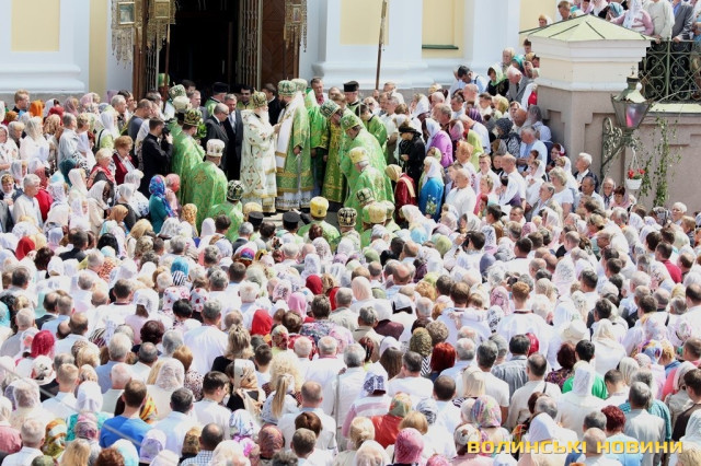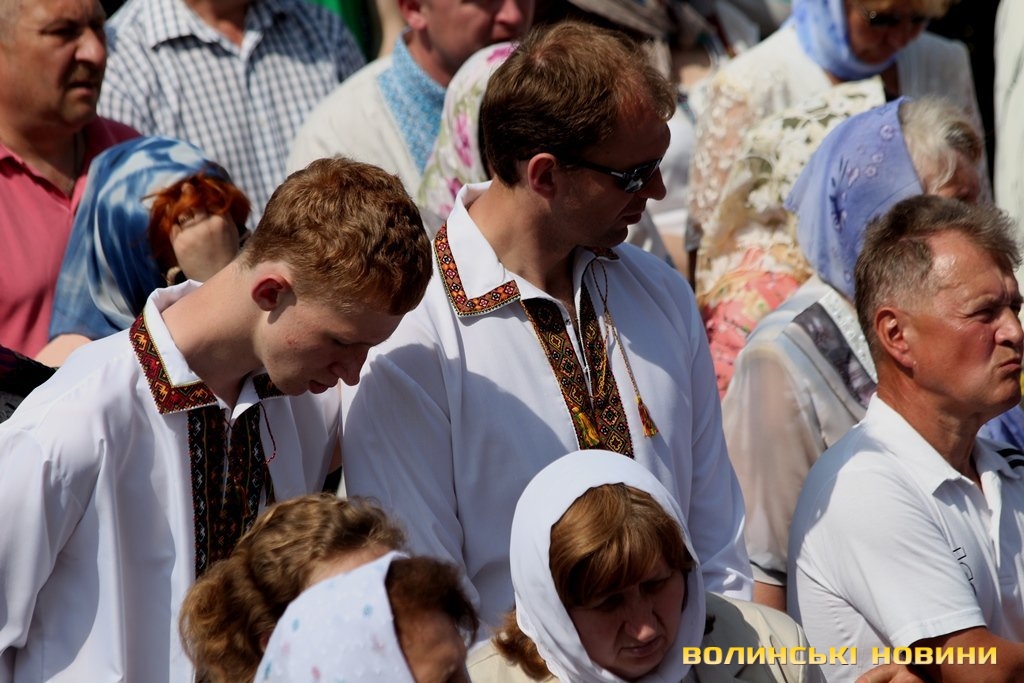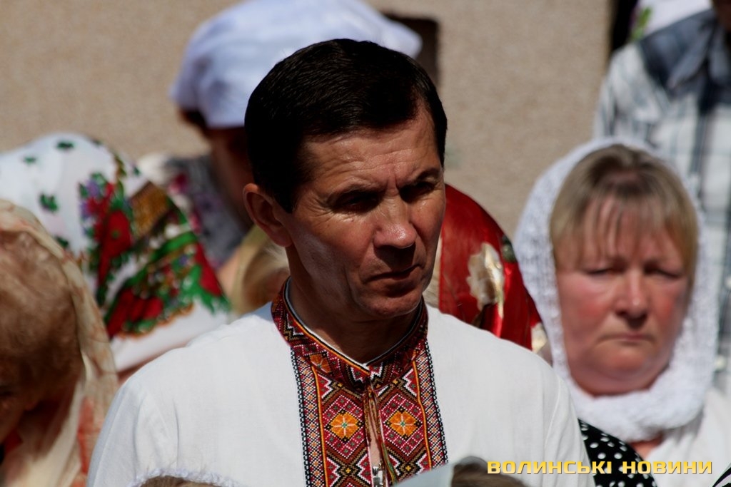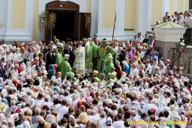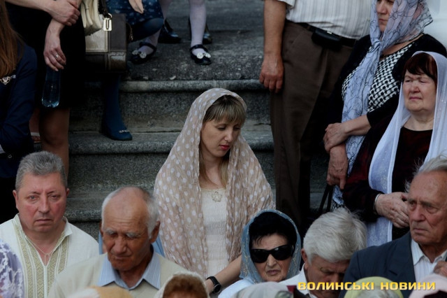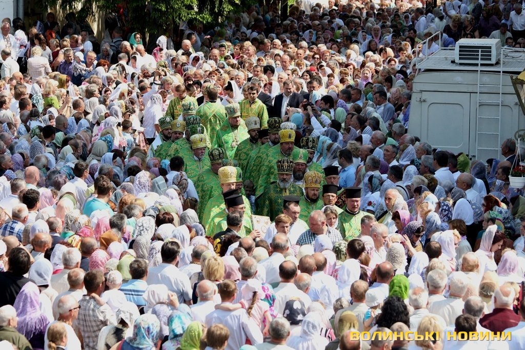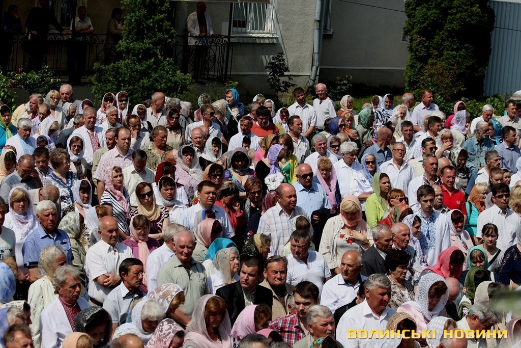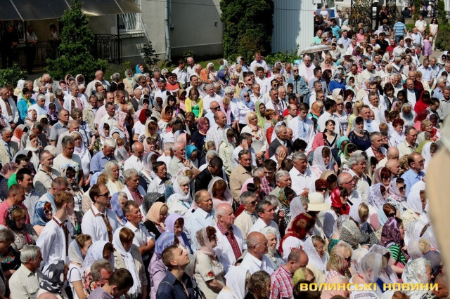 Потому всі рушили хресною ходою навколо храму. В перших рядах за патріархом йшли волинські владці – голова ОДА Володимир Гунчик, голова облради Валентин Вітер, Луцький міський голова Микола Романюк. Вони стояли поруч з патріархом і на сходах наприкінці богослужіння.