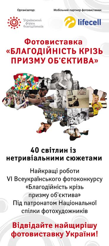 Фотовиставка «Благодійність крізь призму об’єктива» – це найкращі 40 фотографій, обрані з понад 680 фоторобіт, які надійшли з усіх куточків України на VІ Всеукраїнський фотоконкурс «Благодійність крізь призму об’єктива». Фотоконкурс проходив у вересні-листопаді 2015р. за ініціативи Українського форуму благодійників під патронатом Національної спілки фотохудожників України.