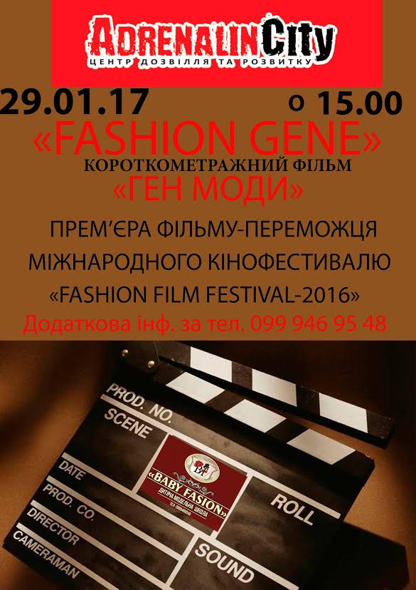 В культурно-розважальному центрі «Адреналін Сіті» відбудеться прем'єра короткометражного фільму-переможця міжнародного кінофествалю Fashion Film Festival -2016. Початок перегляду – о 15:00 год в синій залі кінотеатру.