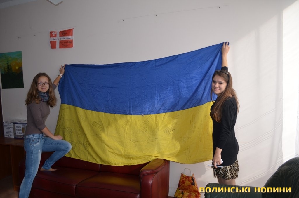 Нагадаємо, що комплексна програма має три частини. По-перше, це надання пільг на сплату за користування житлом, друга частина – соціально-гуманітарна допомога (соціальний супровід учасникам бойових дій АТО, санітарно-курортне лікування, психологічна реабілітація, соціальний супровід сімей учасників АТО). Також програма передбачає посилення просвітницької роботи щодо патріотичного виховання та донесення до широкого загалу важливості роботи, яку виконують військові на Сході. Третя частина програми – матеріально-технічна допомога підрозділам, які беруть участь в АТО (витрати, пов’язані з матеріально-технічним забезпеченням учасників АТО та транспортні витрати).Волонтери продемонстрували Прапор України з підписами лучан, який побував на Савур-Могилі