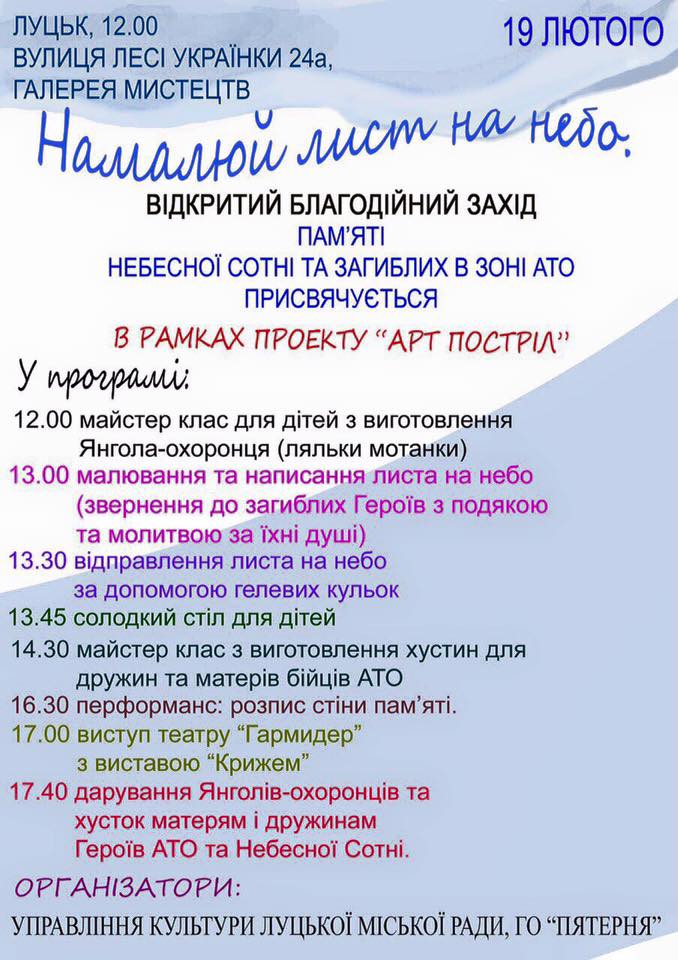 Громадська організація "Пятерня" разом із управлінням культури Луцької міської ради в рамках проекту "АRTПостріл" запрошує всіх мешканців та гостей Луцька на благодійну акцію, присвячену Небесній Сотній та загиблим в АТО "Намалюй листа на небо", - повідомляють організатори заходу.