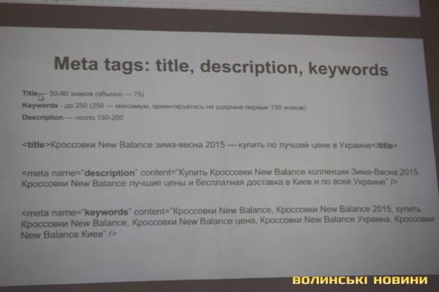 До мета-тегів зараховують: назву сайту, його опис та ключові слова в контенті (title, description, keywords). Їхні розміри не повинні перевищувати 80 символів, оптимально – 50-75. «Переборщите, – наголосив Олег, – ризикуєте опинитися «на дні» рейтингу в пошуковиках, або й взагалі у фільтрі. Іншими словами, – БАН через те, що роботи сприйматимуть ваш сайт як спам».